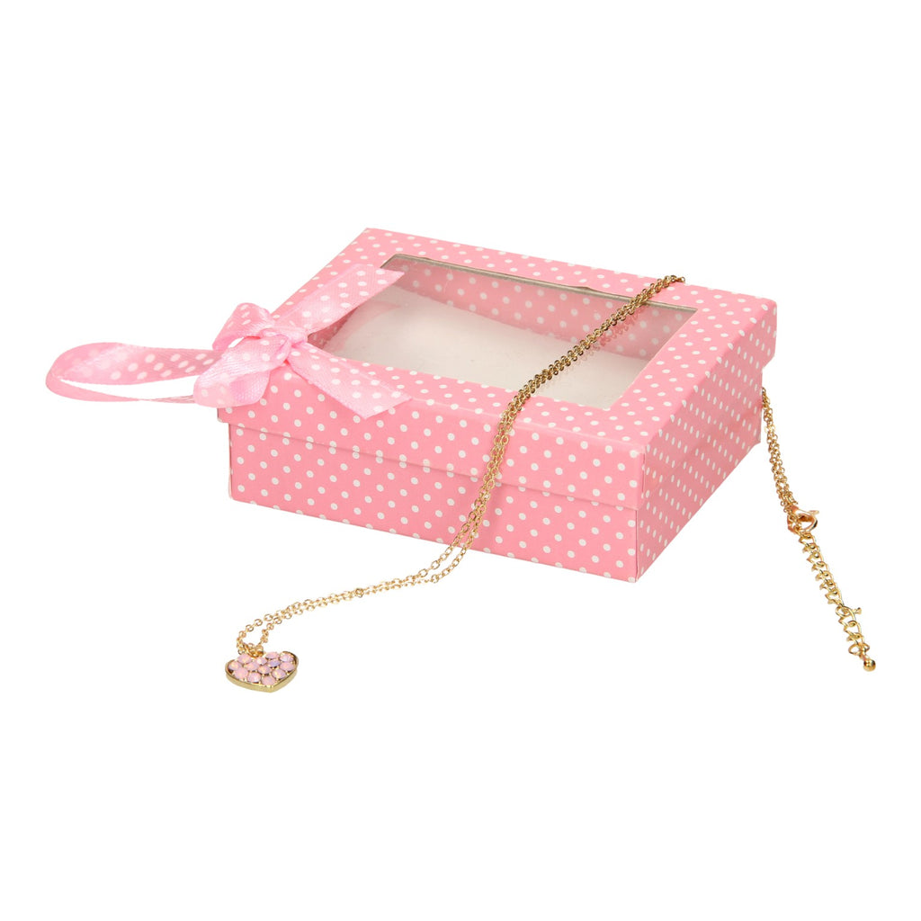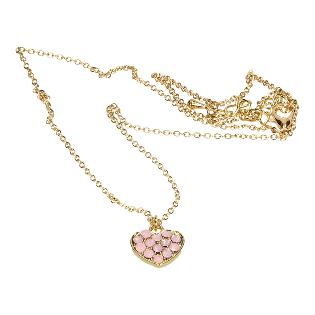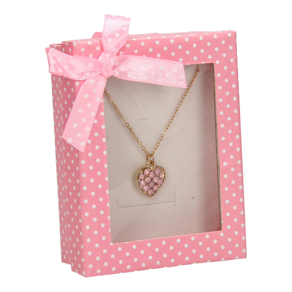 Deze ijzeren ketting heeft een gouden kleur en is voorzien van een bedel in de vorm van een hart. Het hartje heeft roze glitter stenen. De ketting is nikkelvrij, heeft een lengte van ca. 44 cm en is in maat verstelbaar. Komt in een leuke roze cadeauverpakking met een roze strikje.