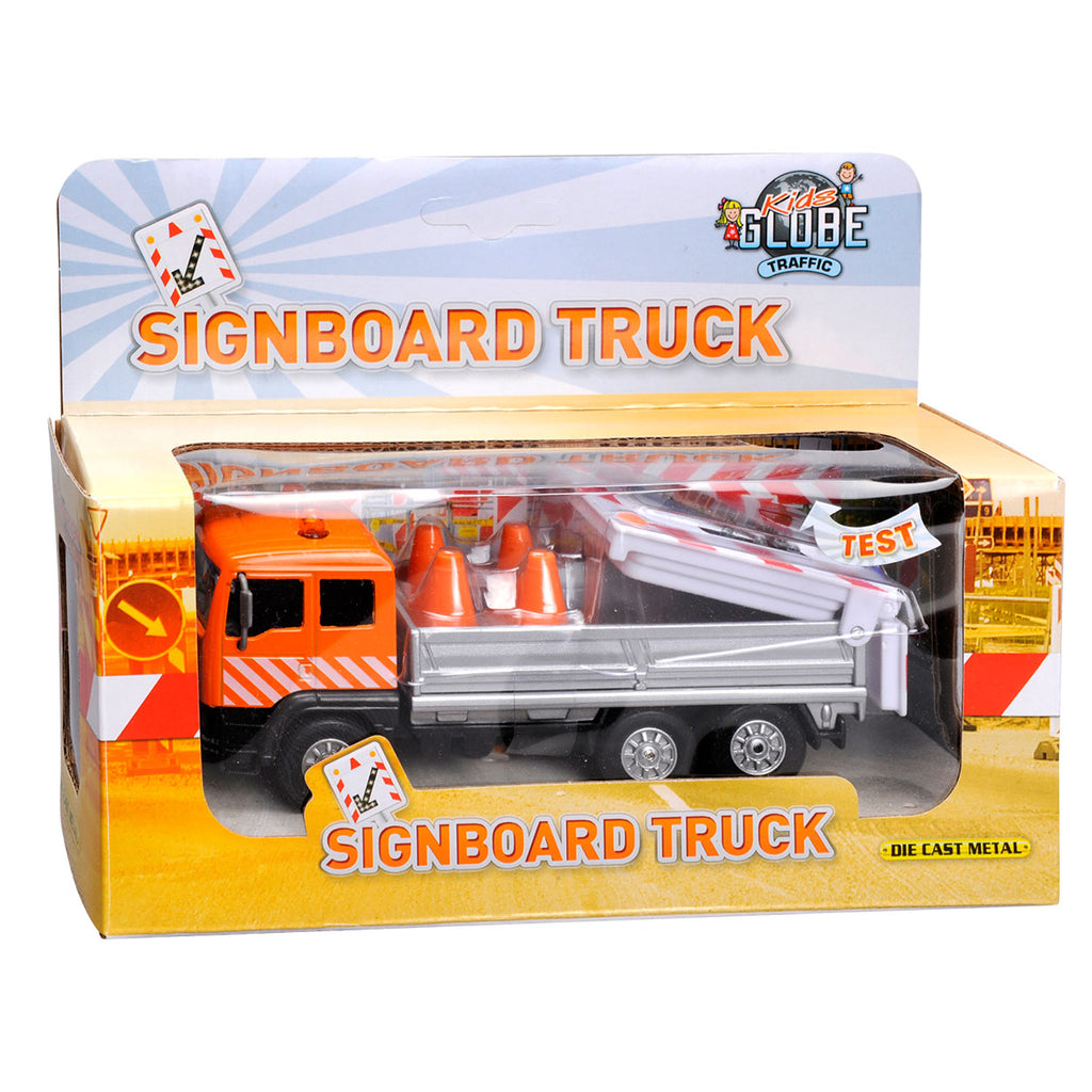 Leuke vrachtwagen met licht en pull back motor. Voordat er gewerkt kan worden aan de weg, moet jij de borden plaatsen!