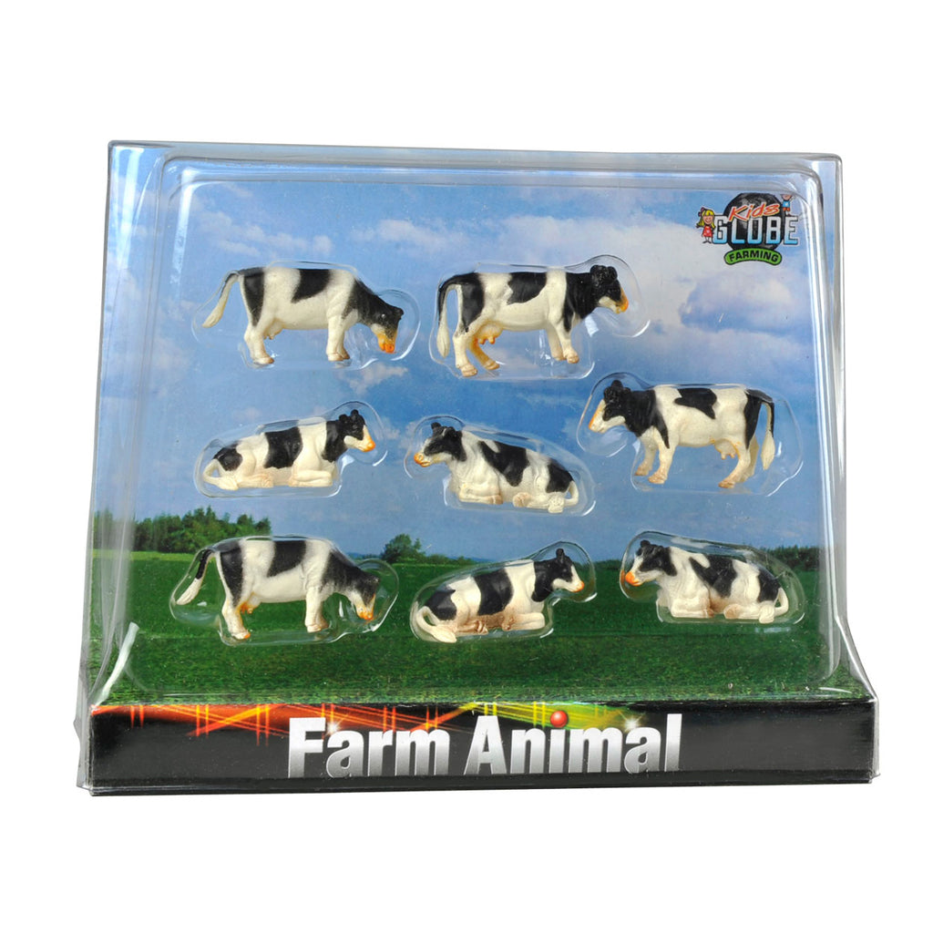 Deze koeien zijn gemaakt van harde kunststof en worden per 8 stuks verpakt. Sommige koeien staan rechtop, andere staan te grazen en de helft ligt gewoon lekker uit te rusten! Op schaal 1:87, past bij de kleine loopstallen van Kids Globe.