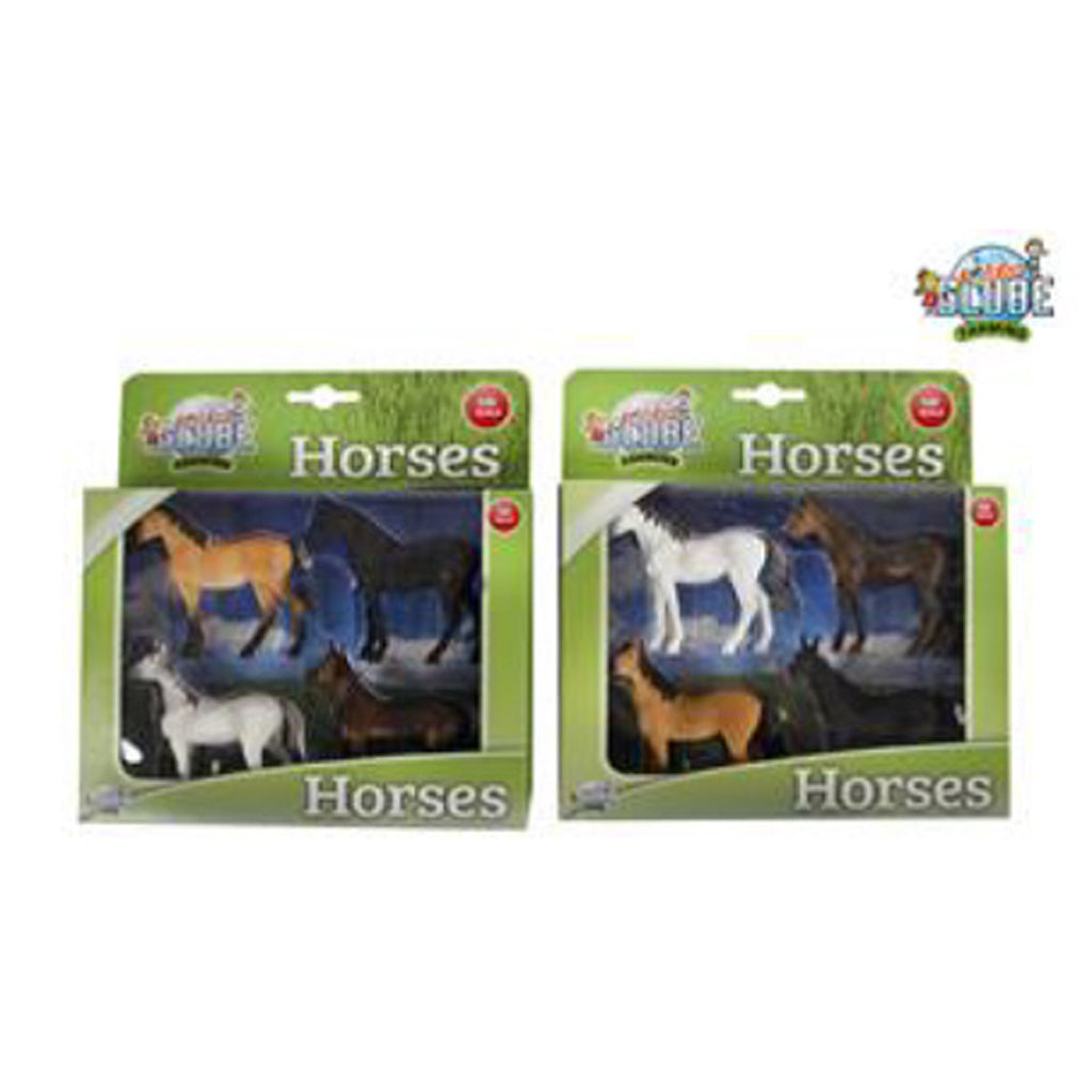 Mooie set met vier paarden, perfect op schaal 1:32. Alle artikelen van Kids Globe schaal 1:32 passen precies bij de paarden. Laat je paarden een rondje rijden en geef ze daarna weer een goede plek in jouw stal. Zorg jij goed voor de paarden?