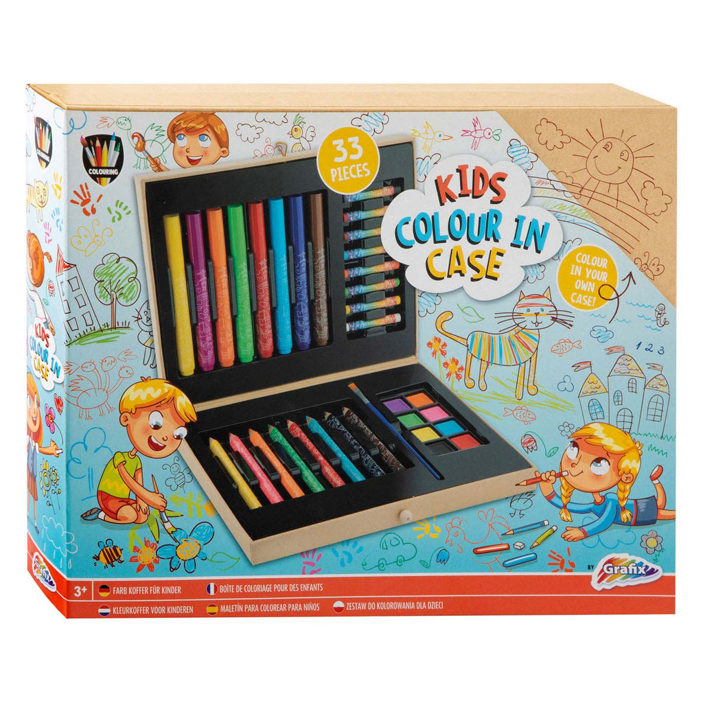 Stevige kleurkoffer van sterk karton met 8 stiften, 8 potloden, 8 krijtjes en 8 kleuren waterverf. Incl. penseel. Afmeting: 26 bij 20 bij 4 cm. Geschikt voor kinderen vanaf 3 jaar.