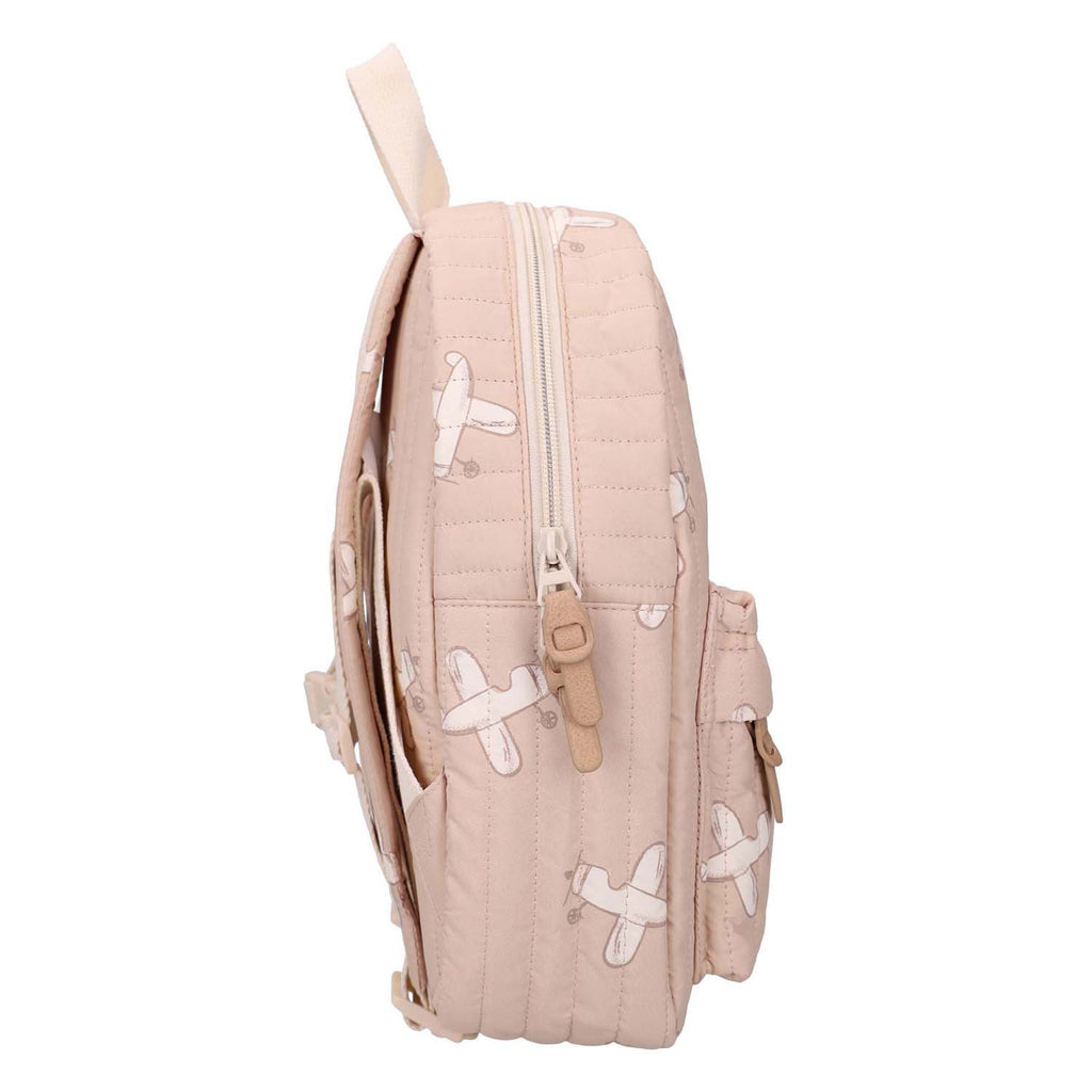 Dit schattige beige rugzakje uit de betoverende Wonderful Worlds-collectie is de perfecte metgezel voor elk avontuur. De tas is vrolijk versierd met een all-over vliegtuigprint en combineert een speelse uitstraling met praktische details. Het ruime hoofdvak met dubbele rits biedt voldoende plek voor een broodtrommel en drinkfles, ideaal voor school of een dagje uit, terwijl het handige voorvak met rits kleine spulletjes veilig opbergt. Dankzij de verstelbare schouderbanden met gespen zit de rugzak altijd comfortabel, en met de stevige lus aan de bovenzijde kan hij ook gemakkelijk in de hand gedragen of opgehangen worden. Binnenin is de tas voorzien van een naamlabel en een speciale houder voor een drinkfles, zodat alles netjes op zijn plek blijft. Een praktische én schattige must-have voor je kindje!