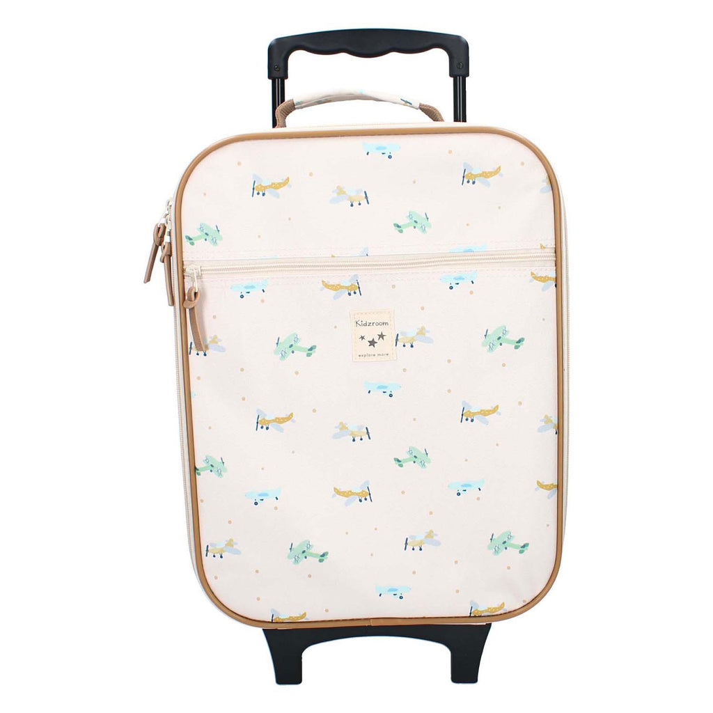 Op reis gaan wordt een nog groter feestje met deze trolley van Kidzroom uit de ???Small Talk??? collectie. Vanaf nu kan jouw kind zijn of haar vakantie spullen zelf meenemen en kun je de koffer eenvoudig herkennen door de gave print. Het grote hoofdvak biedt voldoende ruimte voor zwemkleding, speelgoed en zonnebrand. Maar daarnaast passen ook de nodige normale kledingsetjes en schoenen erin. De trolley koffer is licht grijs van kleur en voorzien van een all-over print met vliegtuigen. Door middel van de dubbele ritssluiting kun je eenvoudig bij de nodige spullen. Het handvat is uittrekbaar en de twee wieltjes zorgen ervoor dat de trolley makkelijk voort te trekken is. De koffer beschikt verder over een voorvak met ritssluiting voor kleinere items zoals ondergoed en verzorgingsproducten.