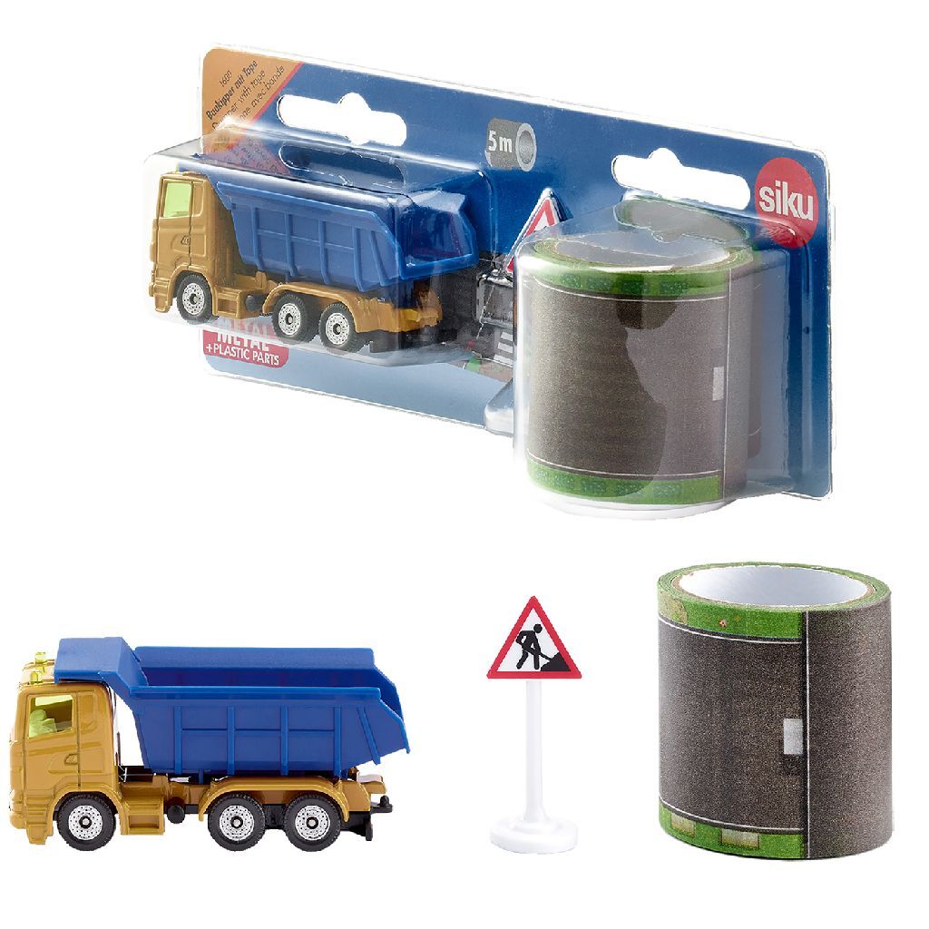 Let op bouwverkeer! - Let op bouwverkeer! De zware vrachtwagen rijdt voor en kiept de bak met grind leeg. De siku kipper is met de metalen chauffeurscabine en chassis ook geschikt voor de zware inzet op de bouwplaats. De bouwkipper met aanhangerkoppeling, het verkeersbord en de tapeband in bouwplaats en wegenlook maken van de kinderkamer een bouwplaats. De tape met een lengte van 5 meter hecht op gladde oppervlaken en kortpolig tapijt. Afmeting ca. 8,3 x 3,0 x 3,8 cm.