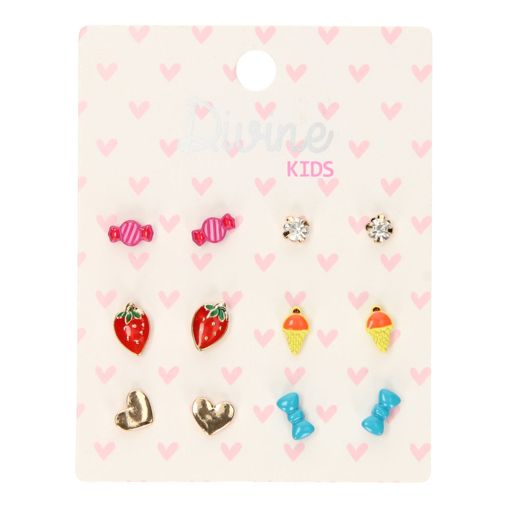 Set van 6 paar nikkelvrije kinder oorknopjes in de vorm van een snoepje, aardbeitje, hartje, ijsje, strikje en steentje.