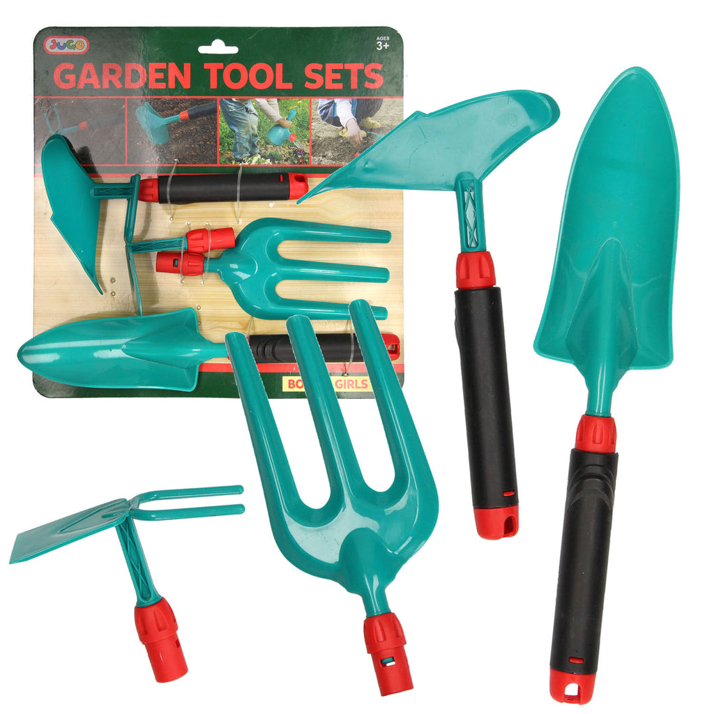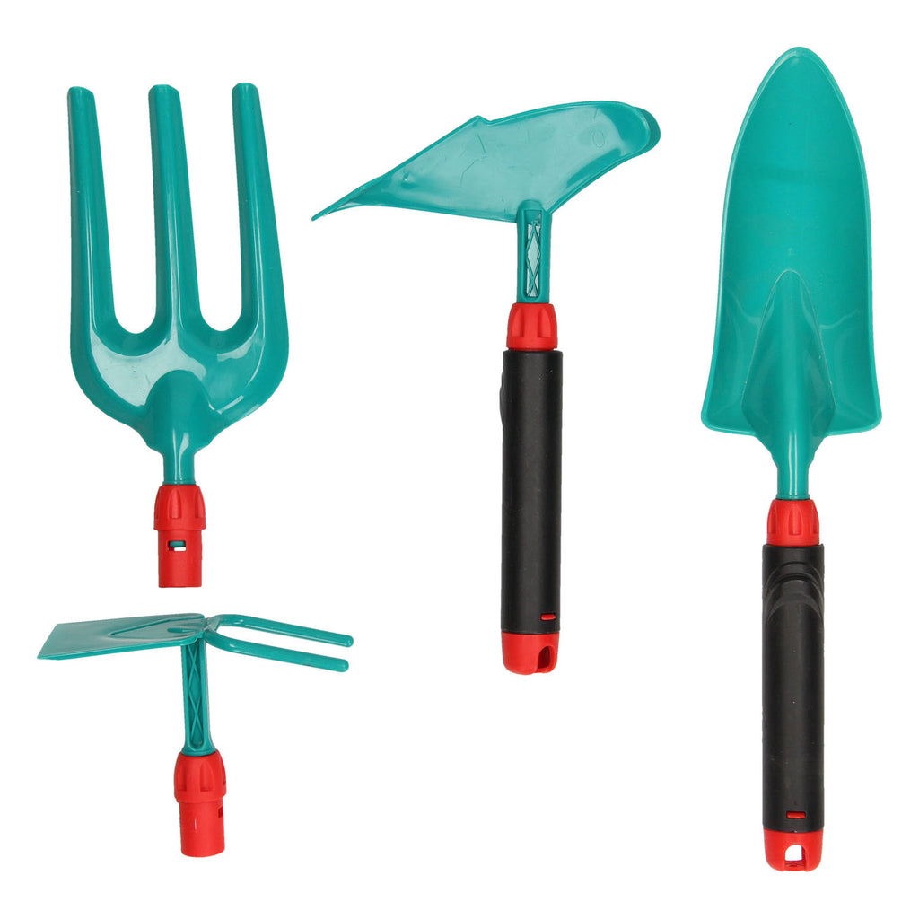 4 delige tuingereedschapset voor kinderen. 2 handvatten en 4 opzetstukken. Gemaakt van kunststof. Geschikt voor kinderen van 3 tot 6 jaar oud.