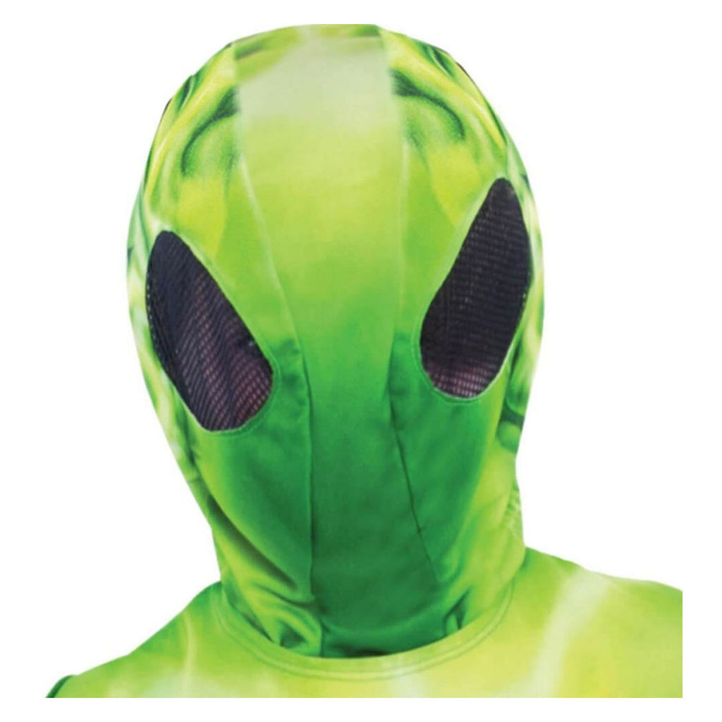 Verkleedkostuum van een buitenaards wezen voor kinderen van 4 tot 6 jaar (maat 110). Gemaakt van elastisch polyester. De verkleedset bestaat uit een overall, een paar handschoenen en een masker.