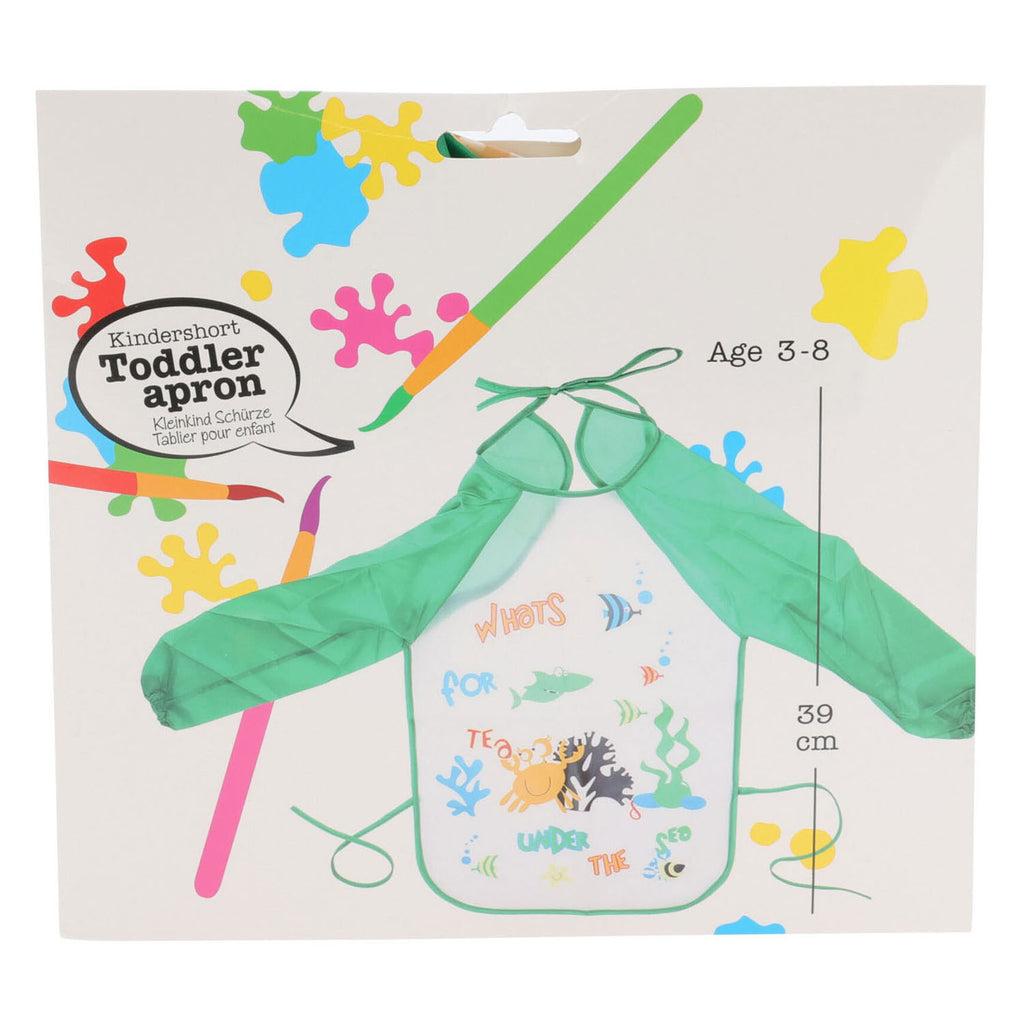 Plastic kinderschort met lange mouwen en strikceintuur aan de achterkant. Het schort heeft een doorzichtig voorpand met print en gekleurde mouwen. Het schort is geschikt voor kinderen van 3 tot 8 jaar en heeft een lengte van 38 cm.