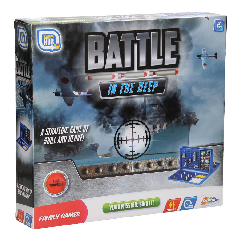 Wie ontdekt als eerste de locatie van de schepen van de tegenpartij in Battle in the Deep? Geef je 5 schepen een plekje op je verticale speelbord en noem telkens een vakje dat jij onder schot neemt. Mis, dan plaats je een wit pinnetje op het horizontale bord. Raak, dan plaats je een geel pinnetje. Als eerste alle 5 de schepen van de tegenpartij raak geschoten, dan ben jij winnaar van het spelletje Battle in the Deep Zeeslag!