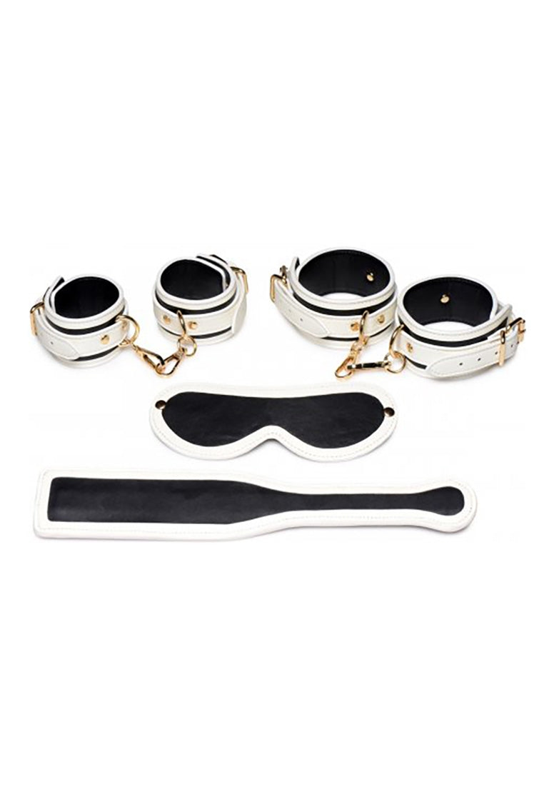 Add a kinky glow to your bedroom bondage fun! This Glowing Bondage Kit makes it easy to tie up your sub and enjoy the world of bondage in the dark. The included cuffs, paddle, and blindfold are an attractive white and gold in the light, but transform into glowing tools of kink so you can play in dimly lit scenes with ease.