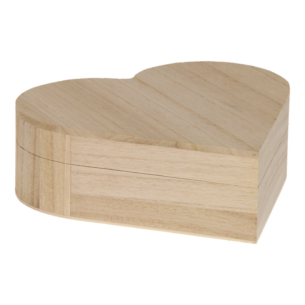 Houten kist in de vorm van een hart. Aan de bovenkant van het hart zitten scharnieren waardoor de kist gemakkelijk open en dicht kan.