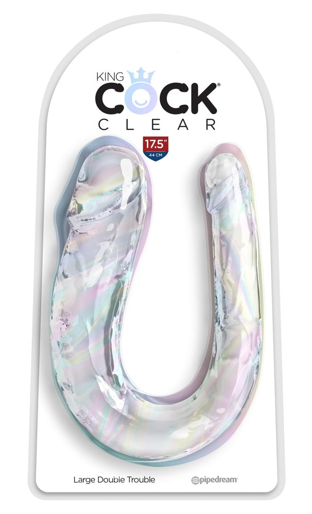 Transparante dubbele dildo Large Double Trouble van King Cock Helder in penislook met uitgesproken aders en eikel aan beide uiteinden. Hij kan aan beide kanten gebruikt worden en is flexibel in alle richtingen. Dit betekent dat de Double Trouble gebruikt kan worden voor allerlei soorten genot: anaal en/of vaginaal, alleen of met z'n tweeën. Gemaakt van zijdezacht TPE, maar toch mooi stijf en flexibel, hij is makkelijk in te brengen en glijdt als bij toverslag.