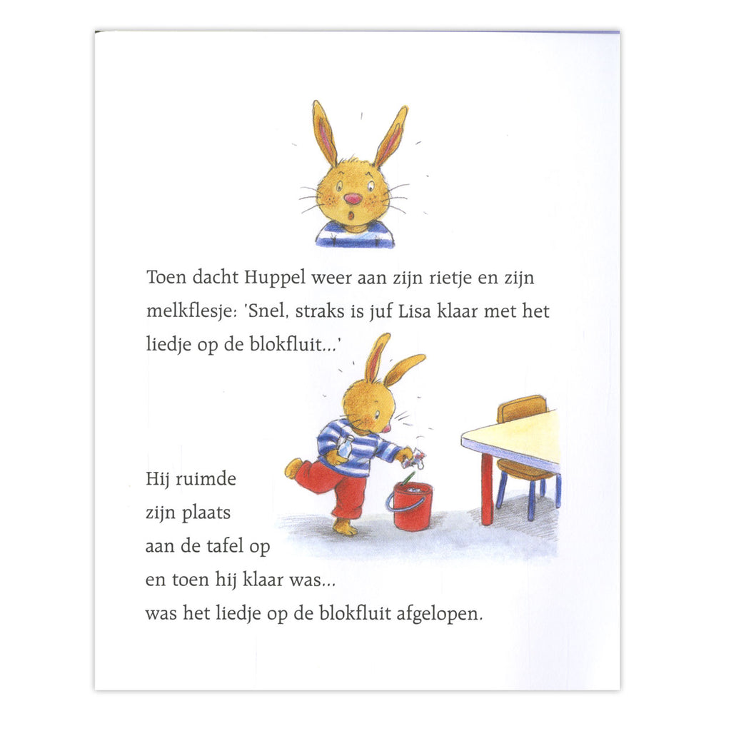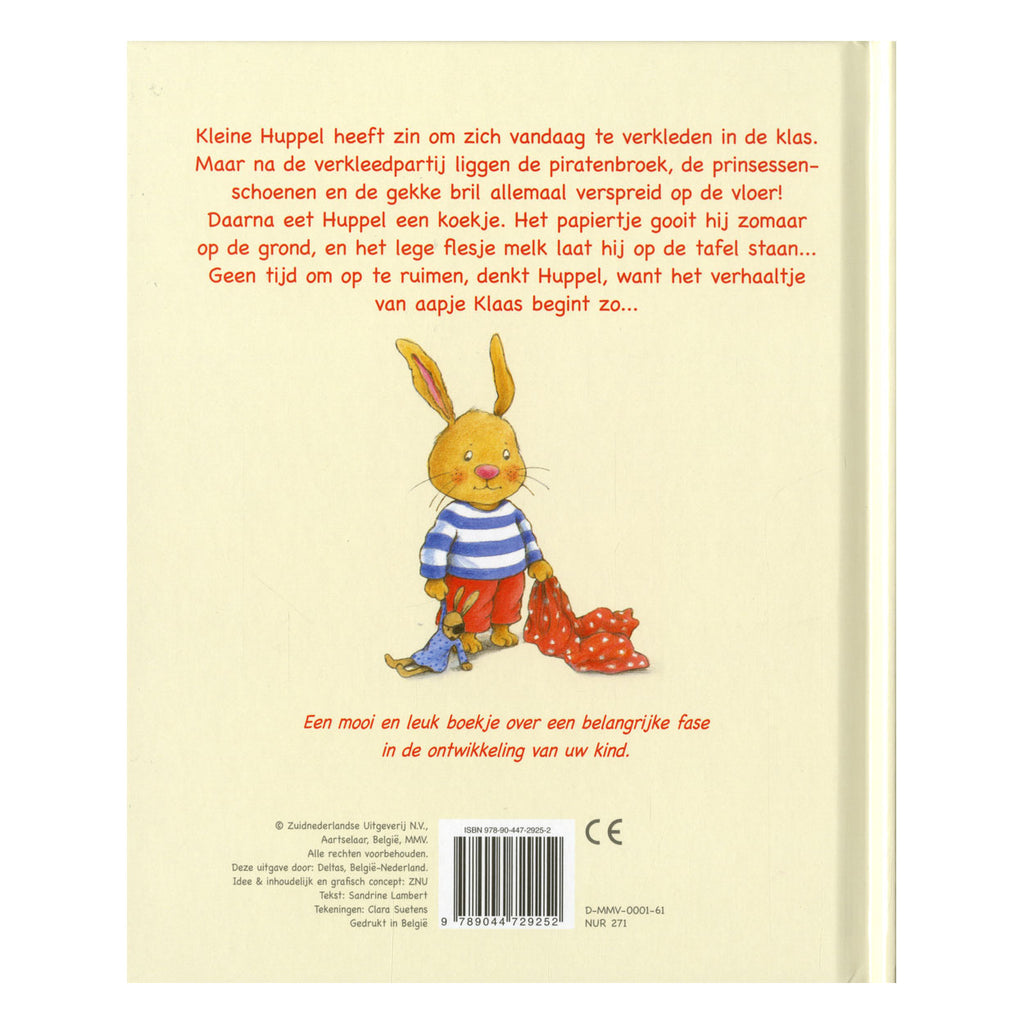 Kleine Huppel heeft zin om zich vandaag te verkleden in de klas. Maar na de verkleedpartij liggen de piratenbroek, de prinsessenschoenen en de gekke bril allemaal verspreid op de vloer! Daarna eet Huppel een koekje. Het papiertje gooit hij zomaar op de grond, en het lege flesje melk laat hij op de tafel staan Geen tijd om op te ruimen, denkt Huppel, want het verhaaltje van aapje Klaas begint zo. Auteur: Sandrine Lambert . Inhoud: 24 pagina's. Uitvoering: gebonden.
