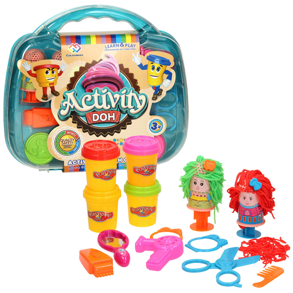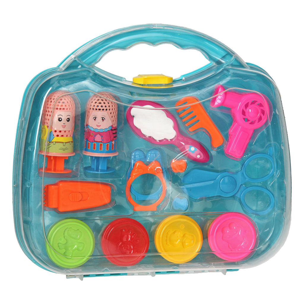 Haal de kapper in jezelf naar boven met deze kleiset in een reiskoffertje! Stop de klei in de vorm en druk deze er aan de bovenkant uit. De klei komt als strengen haar uit de vorm. Nu kun je het knippen, föhnen of afscheren met de bijgevoegde kappersattributen! Gemaakt van kunststof, inclusief vier verschillende kleuren klei.