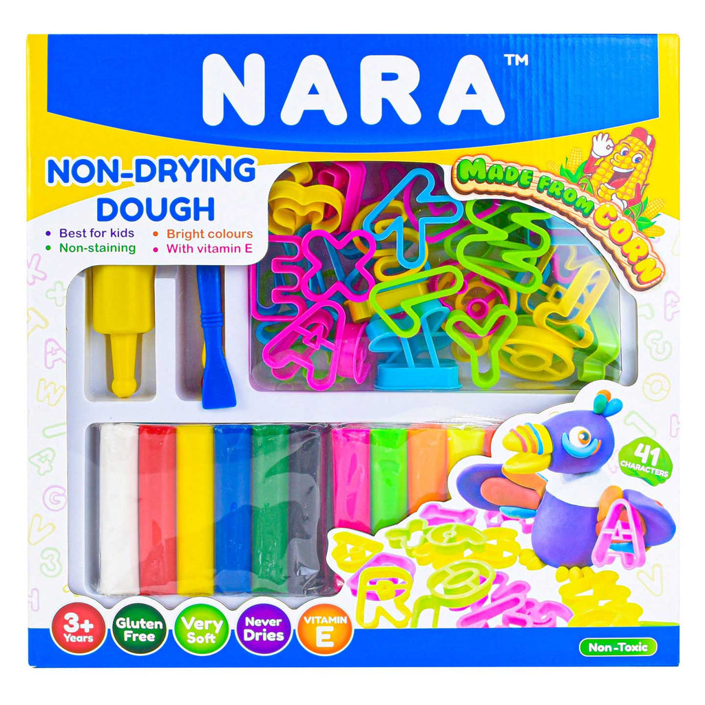 Kleiset met alfabet- en cijfervormen. Met 12 verschillende kleuren klei en 41 kleivormen, een roller en kleimesjes. Geschikt voor kinderen vanaf 3 jaar.