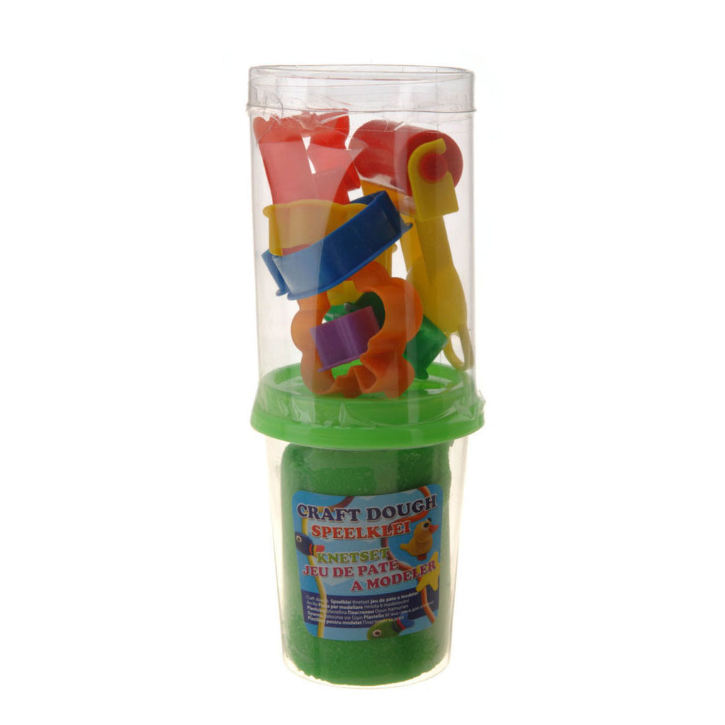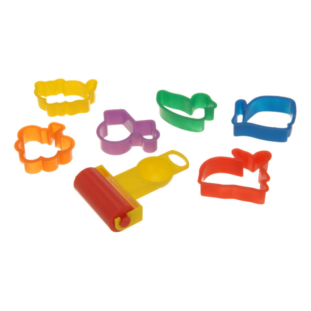Setje met 7 kleiaccessoires (6 kleivormpjes en een roller) en één potje klei. Geschikt voor kinderen vanaf 3 jaar oud.