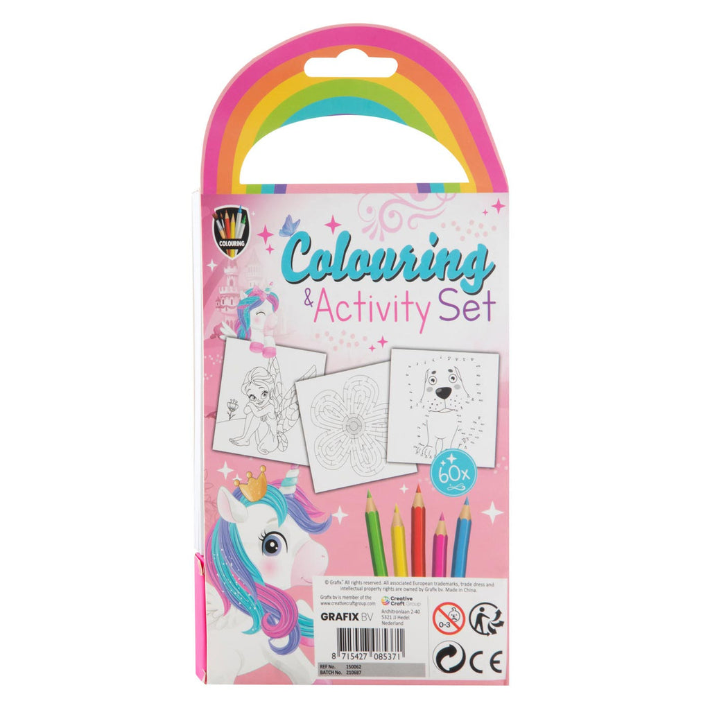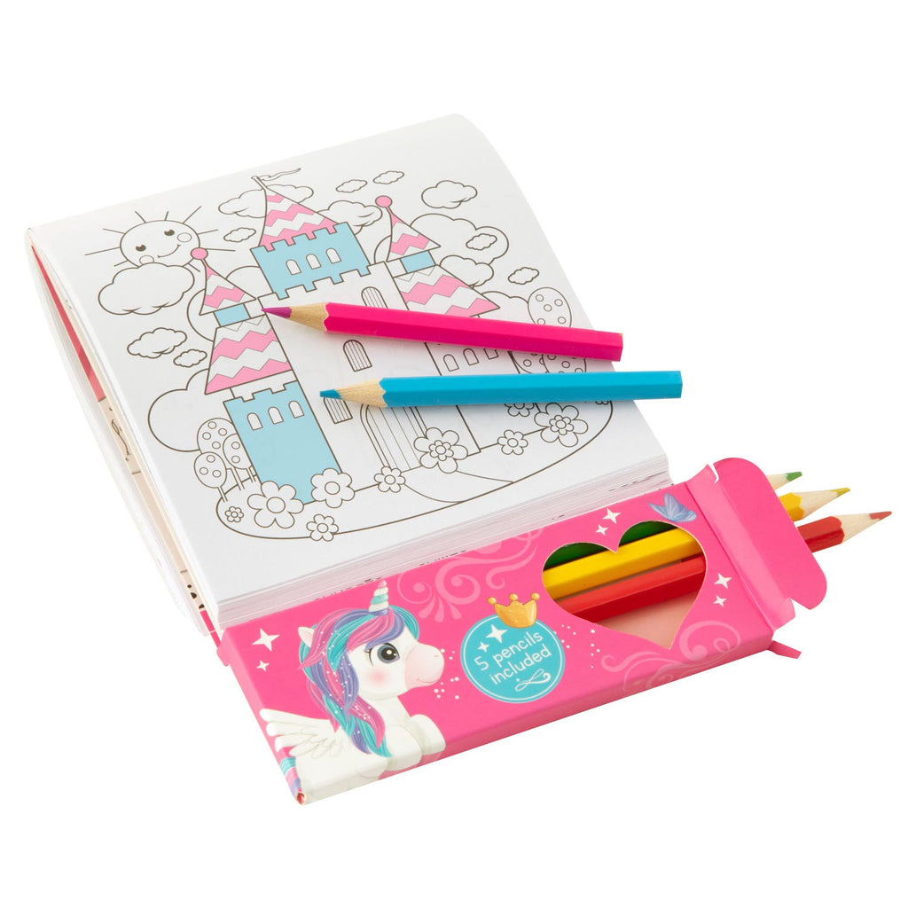 Kleur- en activiteitenblok met eenhoornthema, inclusief 5 kleurpotloden. Geschikt voor kinderen van 3 tot 6 jaar oud.