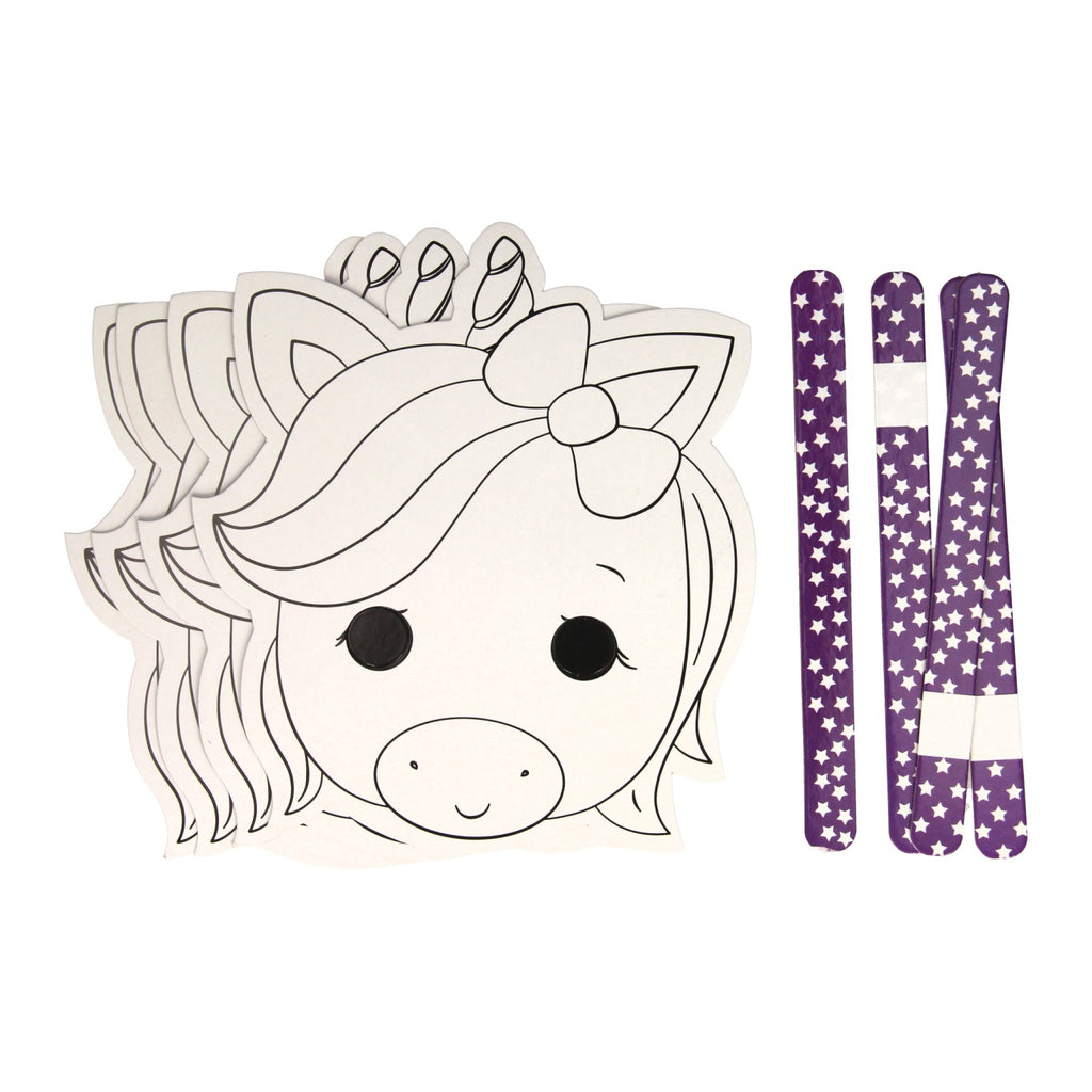 Set met unicornmaskers om zelf te versieren. Inhoud: 4 kartonnen eenhoornmaskers en 4 kartonnen stokjes. Geschikt voor kinderen vanaf 3 jaar.