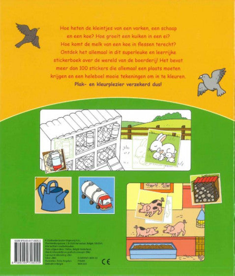 Hoe heten de kleintjes van een varken, een schaap en een koe? Hoe groeit een kuiken in een ei? Hoe komt de melk van een koe in flessen terecht? Ontdek het allemaal in dit superleuke en leerrijke kleur- en stickerboek over de wereld van de boerderij! Het bevat meer dan 100 herbruikbare stickers die allemaal een plaats moeten krijgen en een heleboel mooie tekeningen om in te kleuren. Plak- en kleurplezier verzekerd dus!