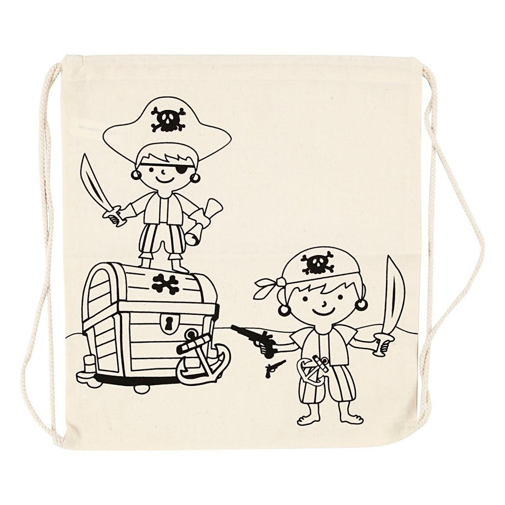 Deze Katoenen Gymtas met een toffe opdruk van 2 piraten kun je zelf inkleuren met behulp van textielverf of stiften. LET OP: verf of stiften worden niet meegeleverd maar zijn apart te bestellen!