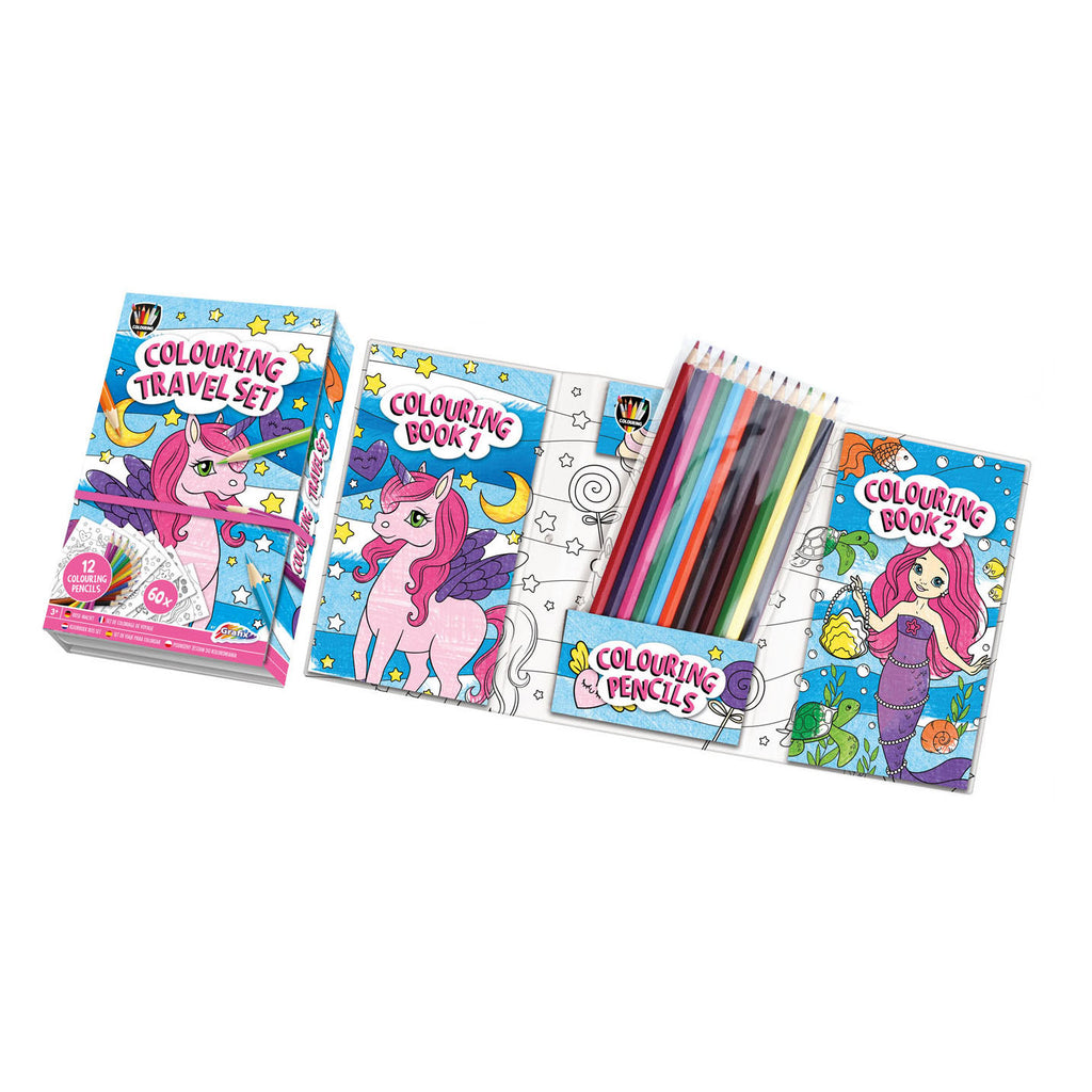 Set van 2 kleurboekjes en 12 fullsize kleurpotloden in handig meeneemformaat. Met 60 kleurvellen met afbeeldingen van eenhoorns en zeemeerminnen. Geschikt vanaf 3 jaar.