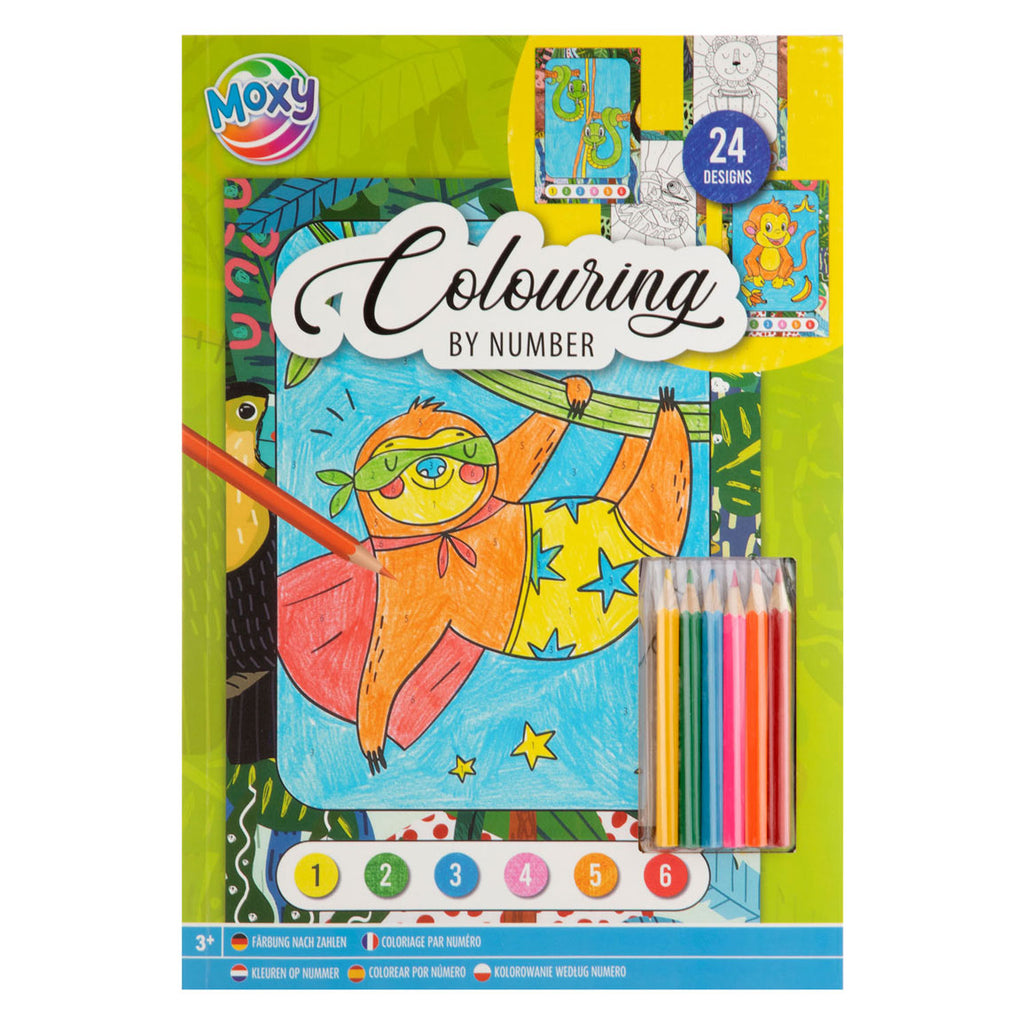 Kleurboek Kleuren op Nummer (A4) met 24 dierenkleurplaten, inclusief 6 kleurpotloden. Geschikt vanaf 3 jaar.