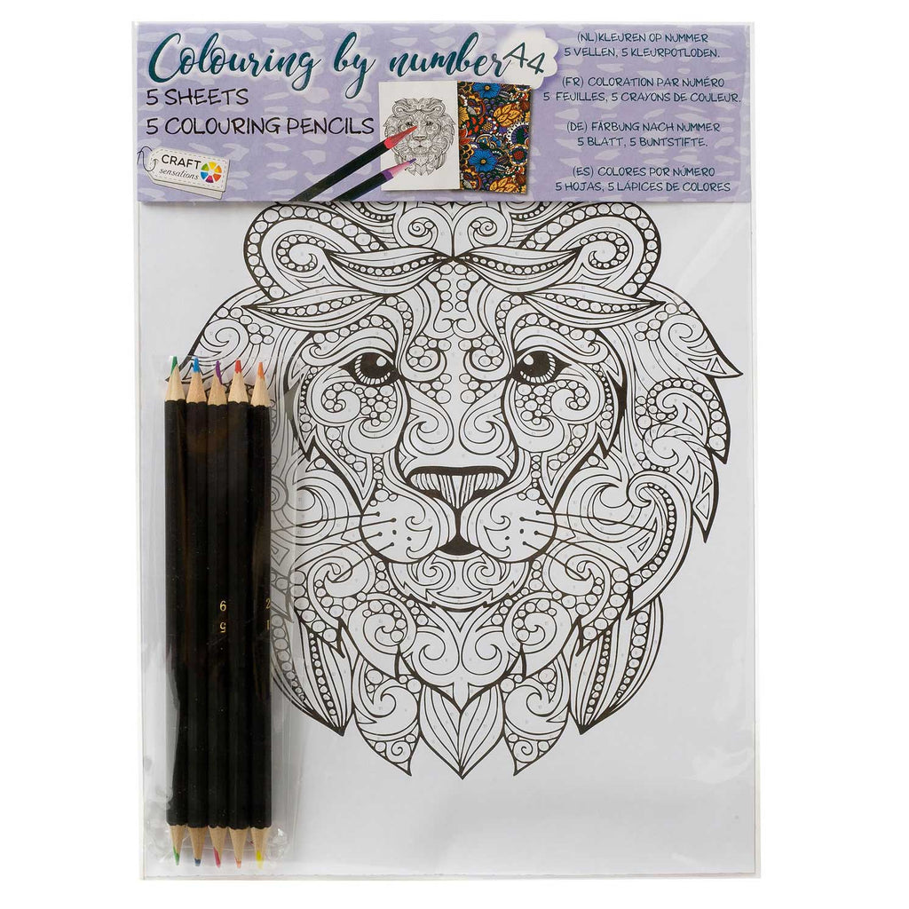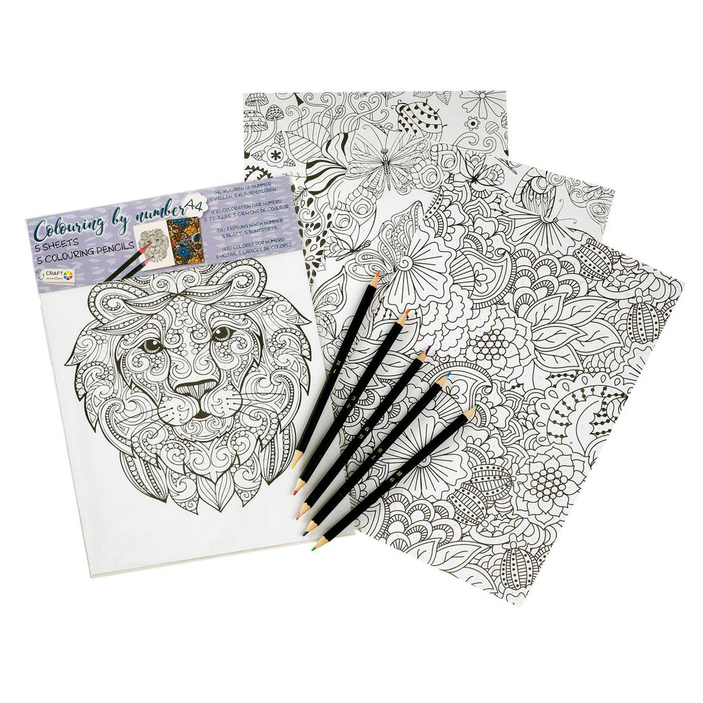 Kleurset met 5 verschillende A4 kleurplaten. Inclusief 5 kleurpotloden.