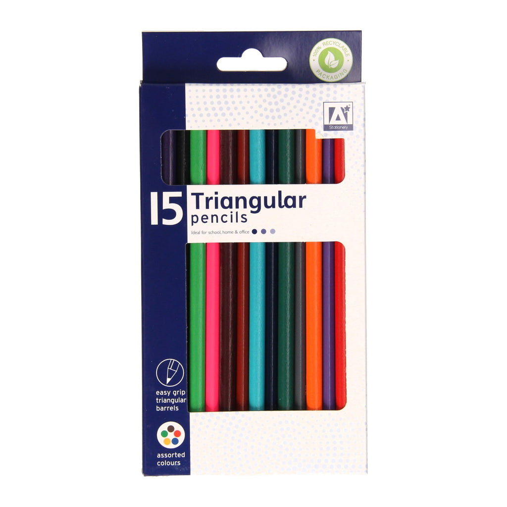 15 stuks kleurpotloden in verschillende kleuren in een driehoekige vorm.