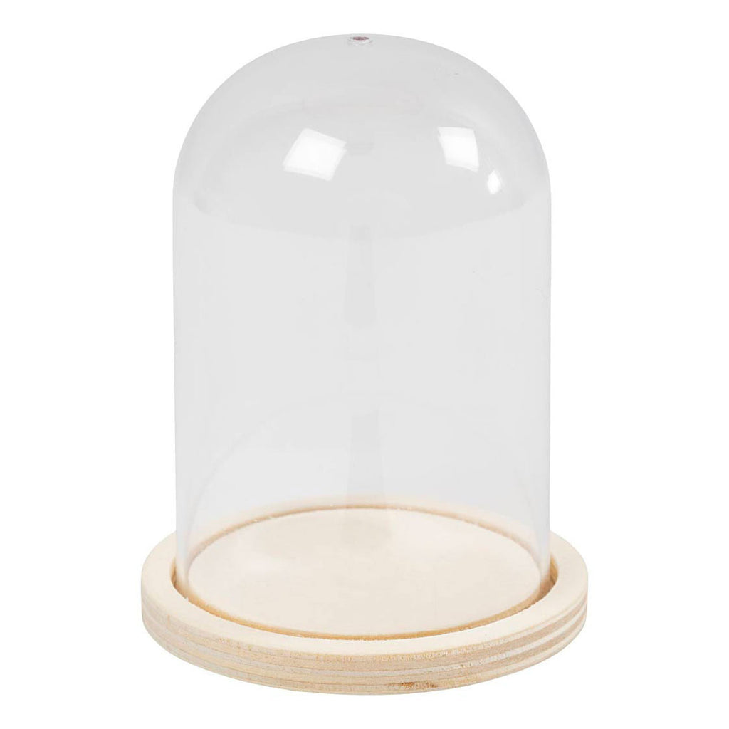 Ronde stolp van plexiglas met losse houten voet, klaar om gevuld te worden met creatieve displays.De ronde stolp van plexiglas kan zowel hangen als staan. Door het gat van 3 mm bovenin de stolp kan een ophangkoord aangebracht worden. Als je de stolp wilt ophangen, raden we aan om de houten basis vast te lijmen. Wil je echter een wisselende display in je stolp maken, hoef je de onderkant niet vast te lijmen
