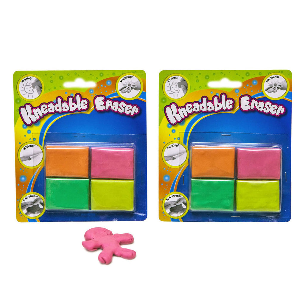 4 stuks kneedbare gummen in 4 verschillende kleuren. Fungeren ook als klei, kneedgum en als stressbal. Afmeting: 4,5 bij 3 cm. Geschikt voor kinderen van 3 tot 6 jaar oud.