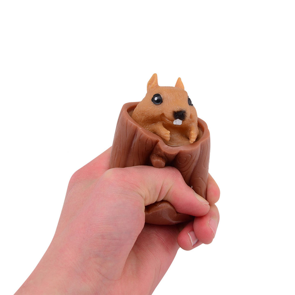 Wie zit er verstopt in deze boomstronk? Knijp er in en je zult het ontdekken... Zie hoe de eekhoorn uit de boomstam plopt als je er hard in knijpt!