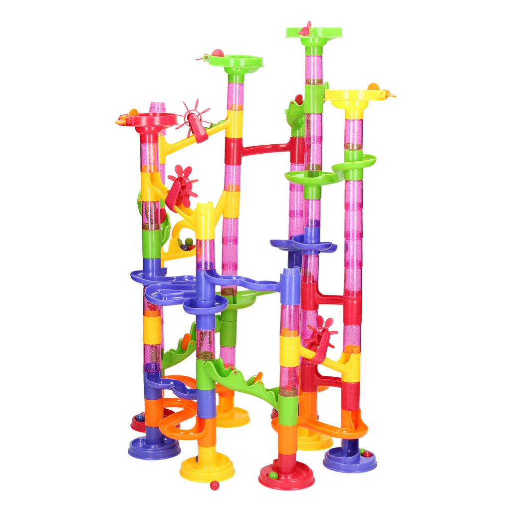 Klaar voor de start, af! Daar kletteren de knikkers naar beneden op de 105-delige Knikkerbaan! Er zijn 10 rode, 10 groene en 10 blauwe knikkers, die elk een eigen startplek hebben. De constructieset bestaat daarnaast uit allerlei soorten 'weggetjes' en hindernissen, zoals steile hellingen, zigzagbanen, poortjes, loopings en ronddraaiende raden! Met de 105-delige Knikkerbaan zijn de mogelijkheden oneindig. Telkens maak je een nieuwe baan en is het spannend welke kleur knikker winnaar wordt van de knikkerrace!