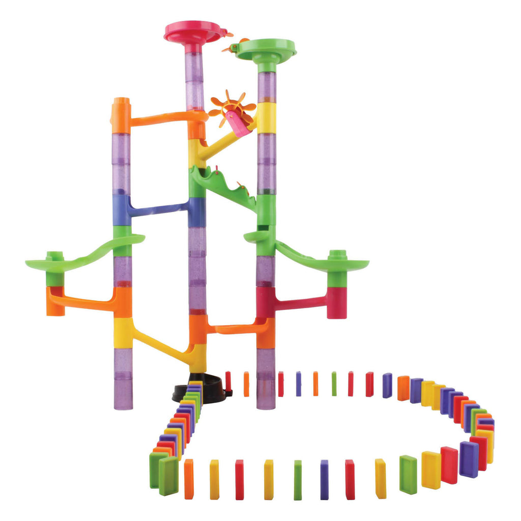 Kleurrijke knikkerbaan & dominoset bestaande uit 100 onderdelen. Geschikt voor kinderen vanaf 3 jaar.