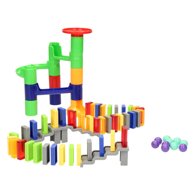 66-delige knikkerbaan met dominostenen. Met verschillende trapetjes, transparante dominostenen en 8 balletjes.