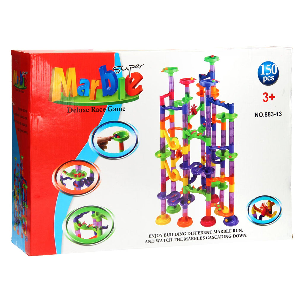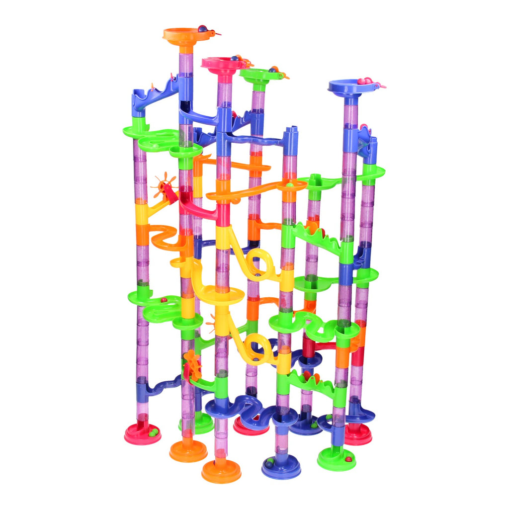 Maak een spectaculaire knikkerbaan met deze megaset. Bouw de spannende baan van het voorbeeld na of laat je fantasie de vrije loop en creëer je eigen ontwerp. Met de 150 verschillende onderdelen creëer je eindeloos veel verschillende banen. Onderdelen zoals snelle spiralen, loopings, ratelende bochten en transparante glitterbuizen maken van elke baan een avontuur. De megaset is gemaakt van stevig kunststof. Inclusief geïllustreerde instructies en knikkers.