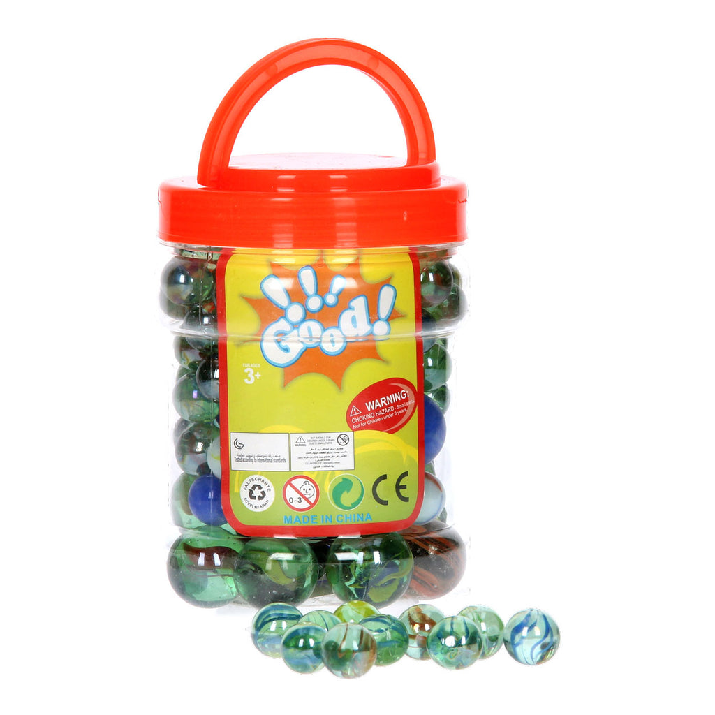 Een pot vol knikkers, makkelijk om mee te nemen! Inhoud: ca. 150 knikkers en bonken.