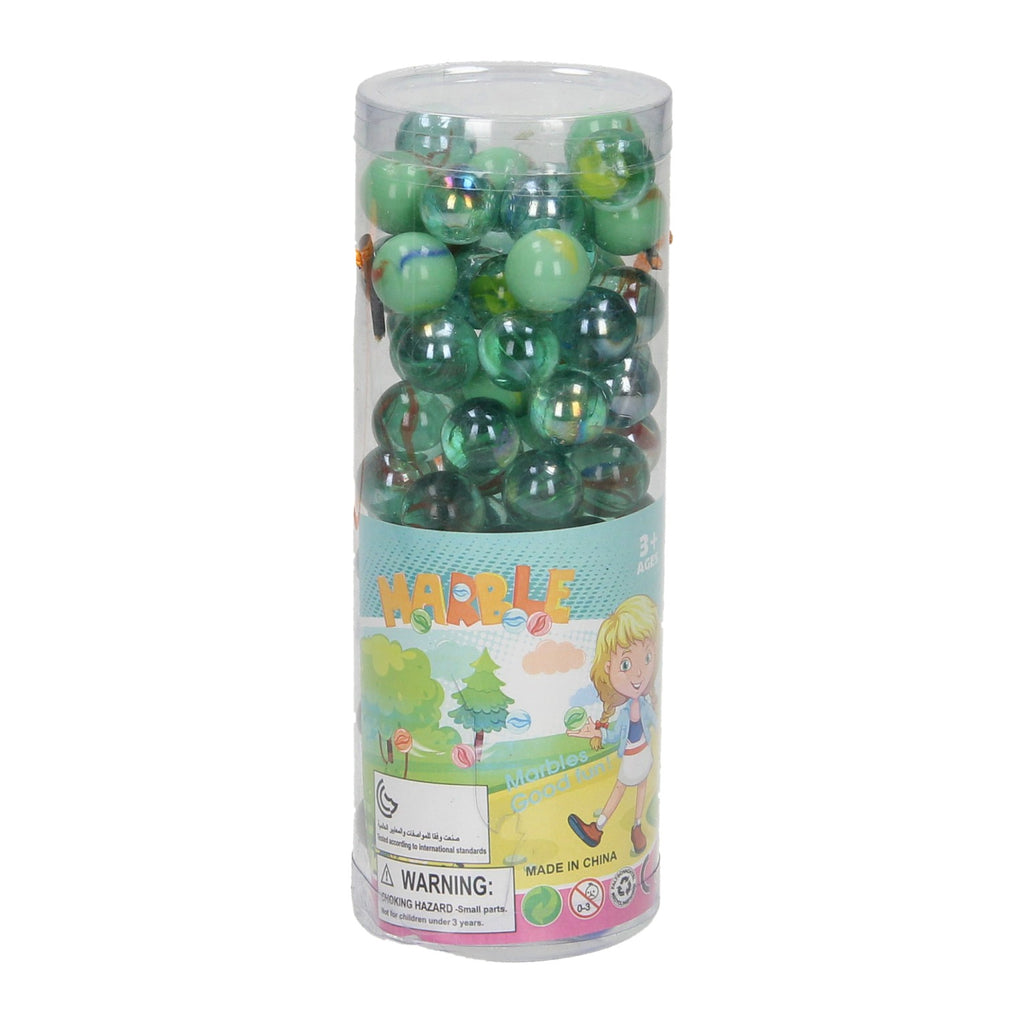 Kunststof koker van 16,5 x 7 centimeter vol met glazen knikkers. Geschikt vanaf 3 jaar.