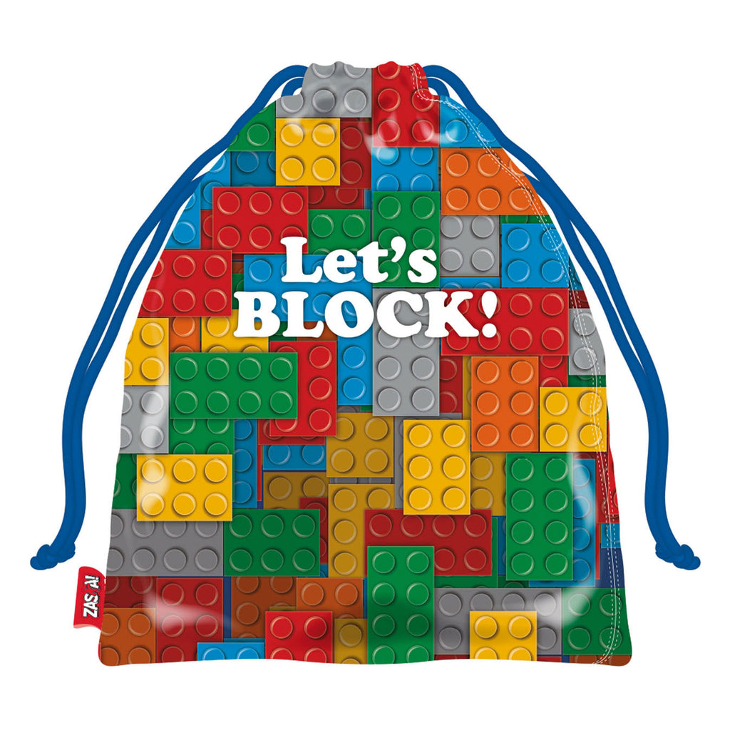 Deze kleurrijke Blocks-knikkerzak is groot genoeg om al jouw mooiste knikkers in te bewaren en mee te nemen. De knikkertas is blauw met aan de voorkant een print van blokjes en de Engelse quote ‘Let’s Block’’. Met het trekkoord kun je de knikkerzak sluiten en dragen. Gemaakt van polyester en 26,5 x 21,5 centimeter groot. Geschikt voor kinderen vanaf 3 jaar.