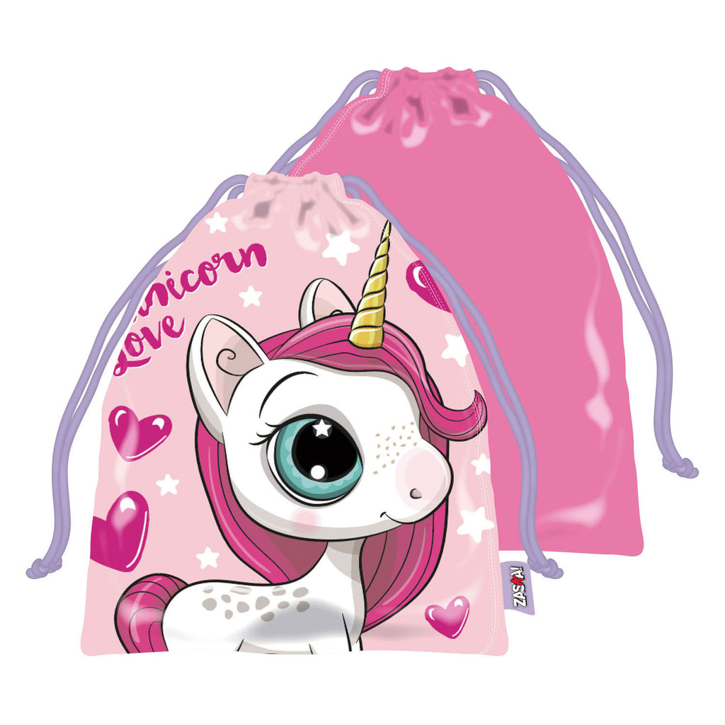 Eenhoorn knikkerzak met paarse trekkoorden. Gemaakt van polyester.