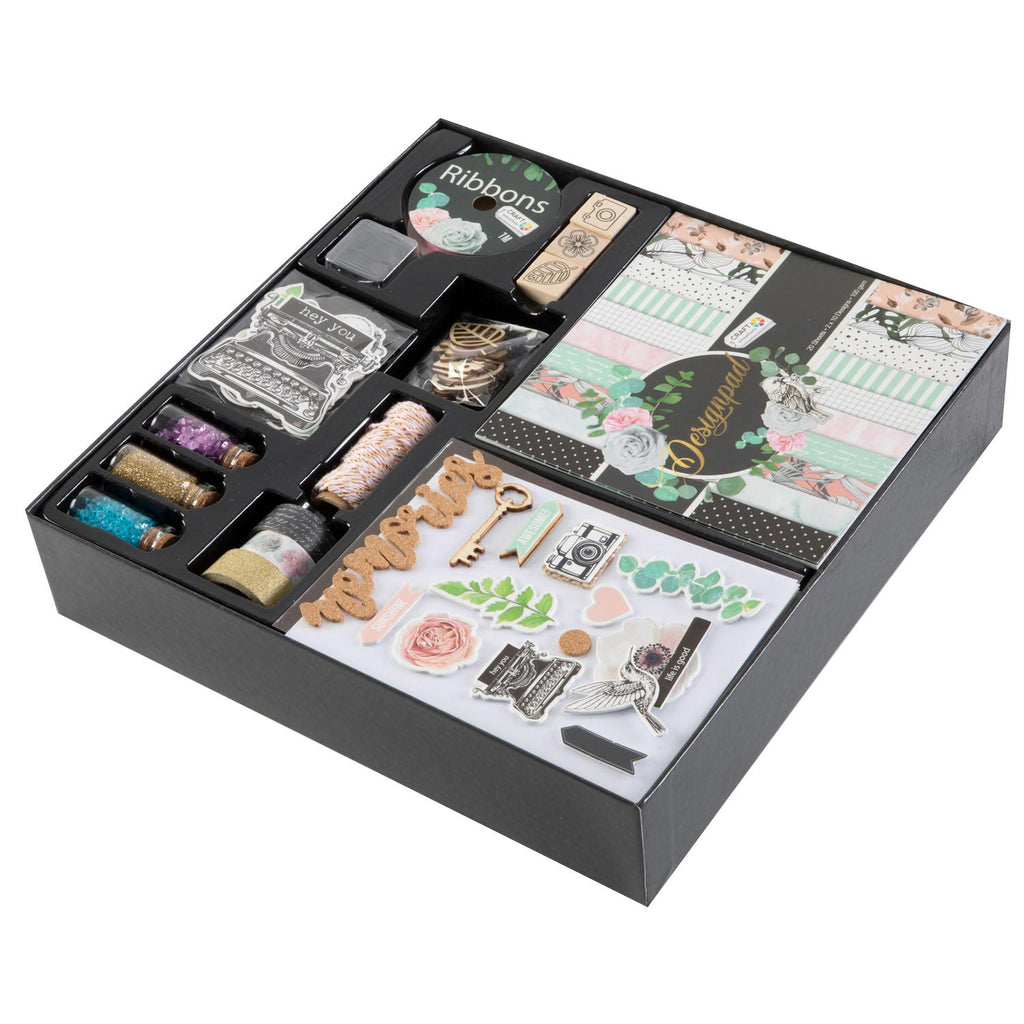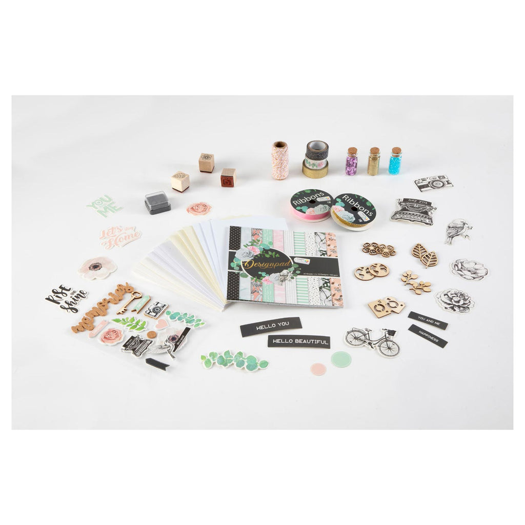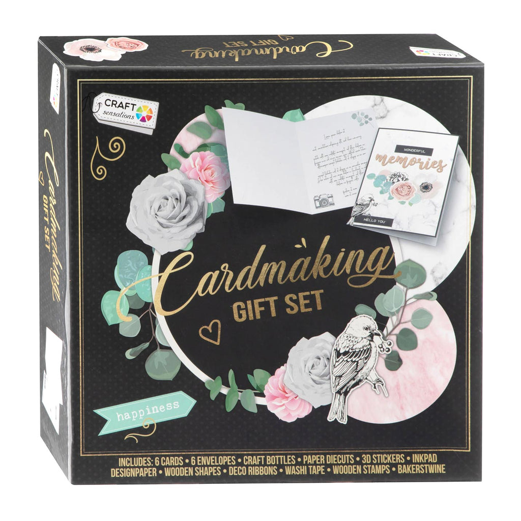 Set om je eigen kaarten mee te knutselen. Inhoud: 6 kaarten, 6 enveloppen, 1 potje pailletten, 1 potje glitters, 1 potje diamantjes, papier stansen, stempelkussen, 3D-stickers, houten figuren, linten, washi tape, houten stempels, touw. Geschikt vanaf 8 jaar.