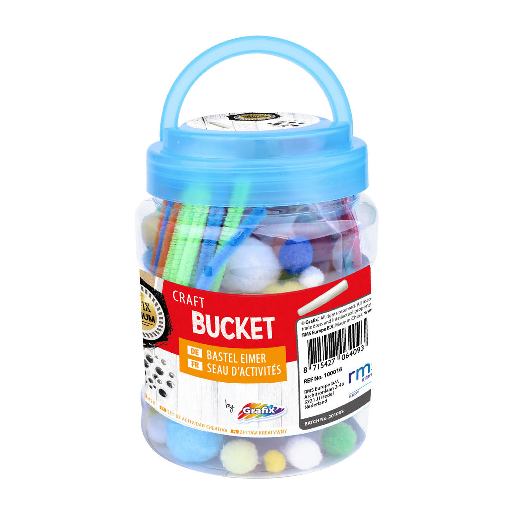 Lekker knutselen met de inhoud van de blauwe Knutselemmer: kleurrijke chenille draden, veertjes, foamstickers van verschillende vormen, oogstickers, pompoms van verschillend formaat en lijm. Met de blauwe Knutselemmer in huis maak je de mooiste kunstwerken!