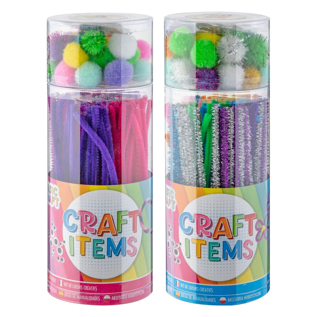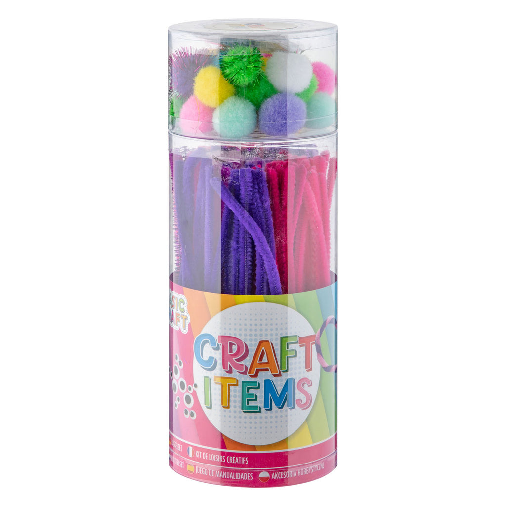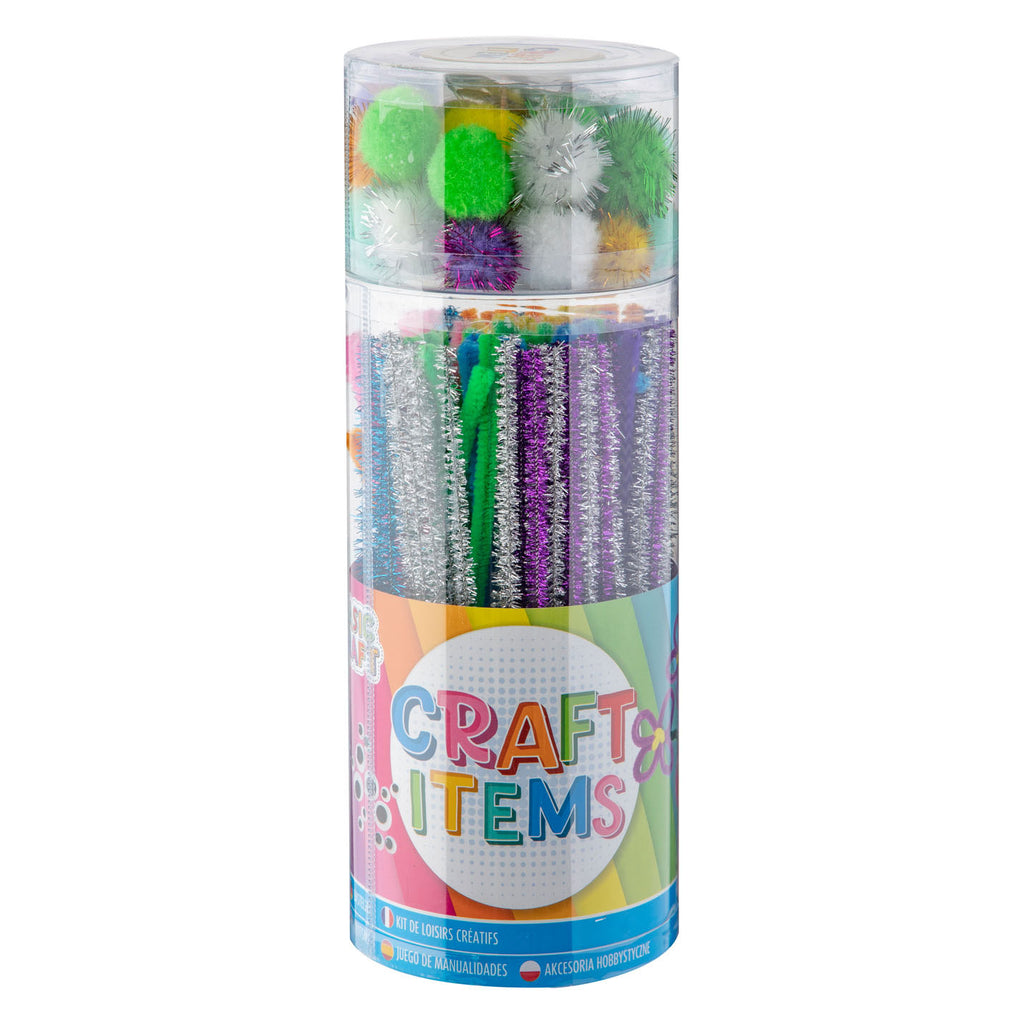 In deze tube zitten verschillende knutselmaterialen om mee te knutselen. Inhoud: 150 chenille staafjes, 30 pomppoms en 30 oogjes.