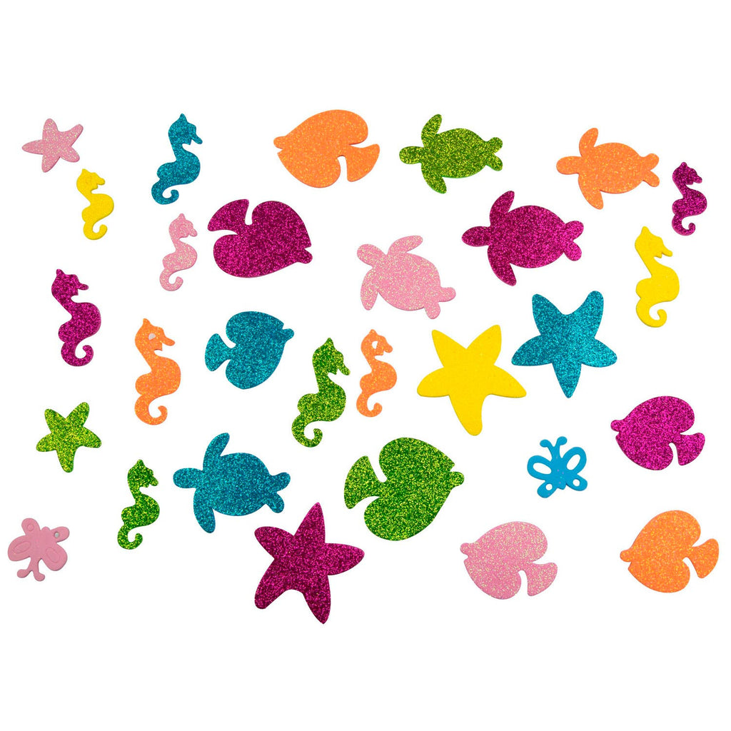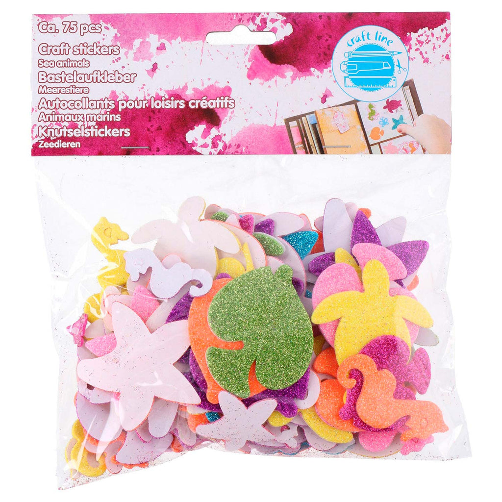 Deze onderwaterwereld stickers zijn gemaakt van foam en hebben de vorm van allerlei zeedieren. De foam stickers zitten onder de glitters en stelen de show op je knutselwerkje! De stickers hebben verschillende formaten. In het zakje zitten ongeveer 75 stickers.