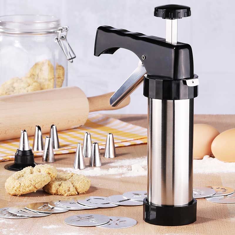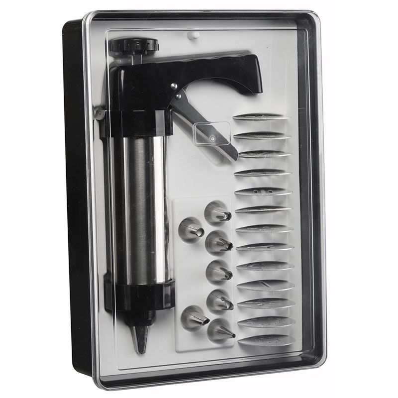 Maak de lekkerste koekjes met deze functionele gebakspers. De koekjespers wordt geleverd met 8 spuitmondjes en 13 sjablonen voor de leukste creaties. Hij is makkelijk te bedienen: plaats een van de sjablonen in de koekjespers en vul hem met deeg, vervolgens duw je de hendel naar beneden. De gehele set wordt geleverd in een handige opbergbox.