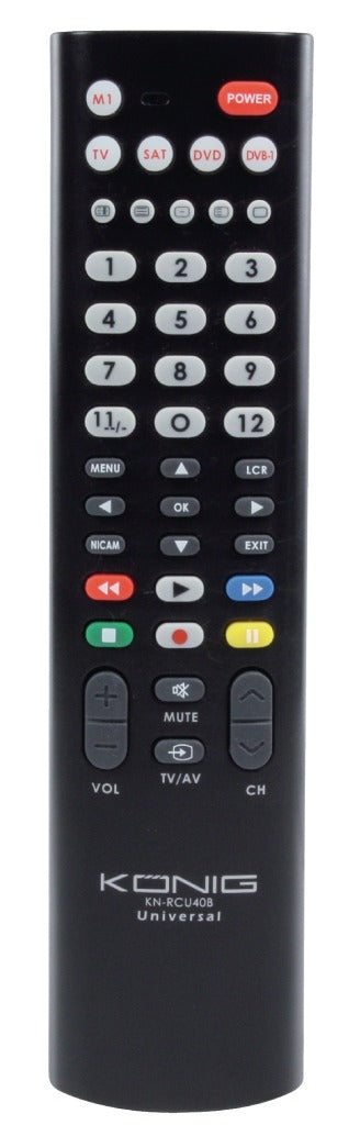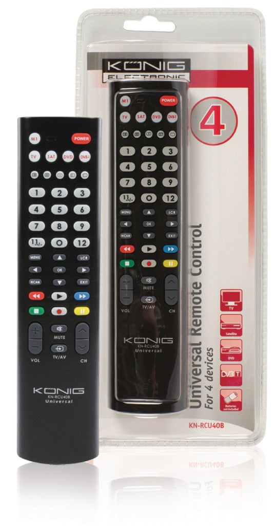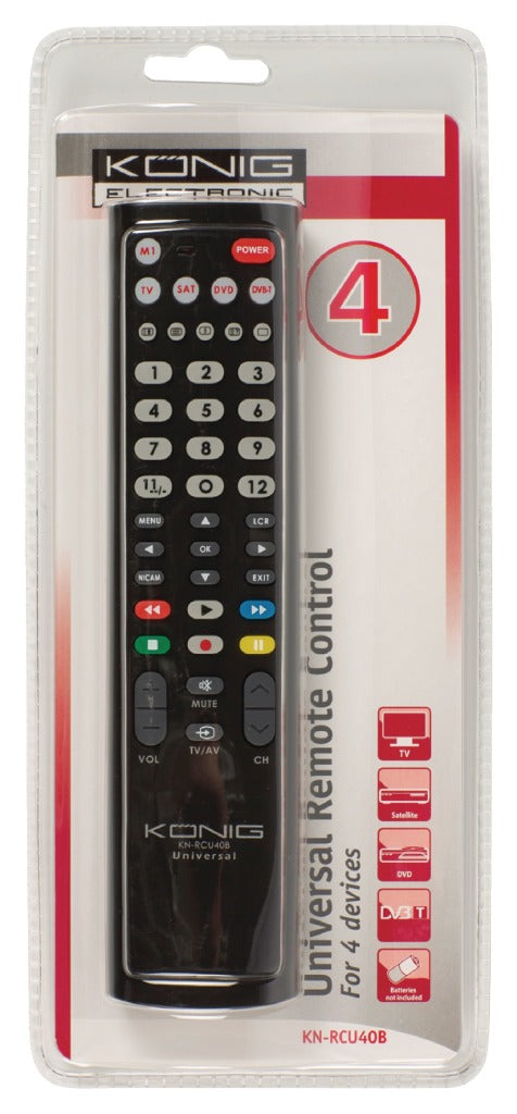 Deze universele afstandsbediening heeft een uitgebreide, ingebouwde database die programmeerbaar is in twee stappen en daarom vrijwel meteen in gebruik kan worden genomen. U hoeft de codes slechts één keer te programmeren, zelfs als u de batterijen heeft vervangen. De afstandsbediening is eenvoudig in gebruik en de perfecte oplossing om uw kapotte of verloren afstandsbediening te vervangen. Deze afstandsbediening is geschikt voor TV's, satellietontvangers, DVB-T-apparaten en DVD-spelers.