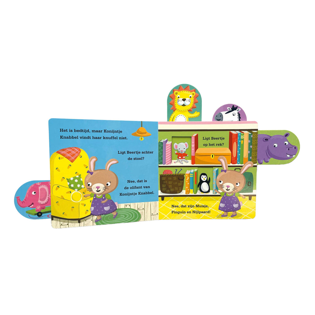 Een kleurrijk interactief boekje over Konijntje Knabbel die haar knuffel niet vindt.Ligt de knuffel achter de stoel? Zit hij in de speelgoedkist? Of ligt hij misschien onder het bed?Laat je kind aan de stevige kartonnen tabs trekken om zo Konijntje Knabbel te helpen zoeken!Samen een boekje lezen heeft een positieve invloed op de visuele ontwikkeling en bevordert de verbeelding terwijl je een hechtere band met je kind opbouwt. Het omdraaien van de pagina's en het trekken aan de tabjes stimuleert de fijne motoriek.Voor nieuwsgierige peuters vanaf 1 jaar