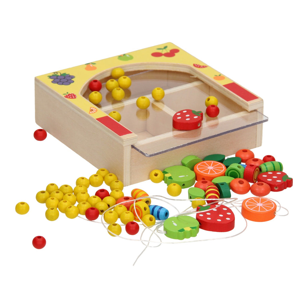 Vrolijk houten kralendoosje met kralen en draad om je eigen sieraden te maken. In het doosje zitten ronde kralen, fruit kralen en diverse andere gekleurde kraalfiguren. Inhoud: circa 70 kralen.