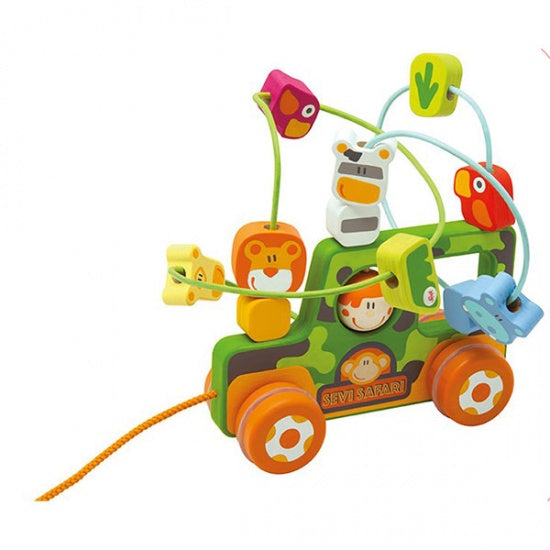Super leuk babyspeelgoed van Sevi. Dit kralenframe bestaat uit twee banen waarover een de dieren zich bewgen. In de jeep zit nog een aantal dieren verstopt. Dit kralenframe kan ook meegetrokken worden door uw kind.