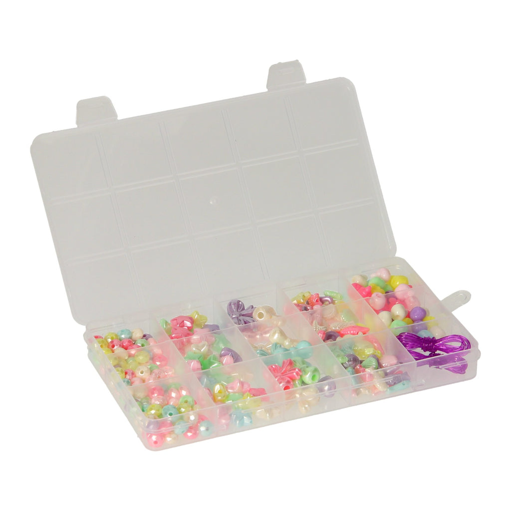 Kunststof opbergdoosje met 15 vakjes parelmoerkralen van kunststof en transparant rijgkoord.