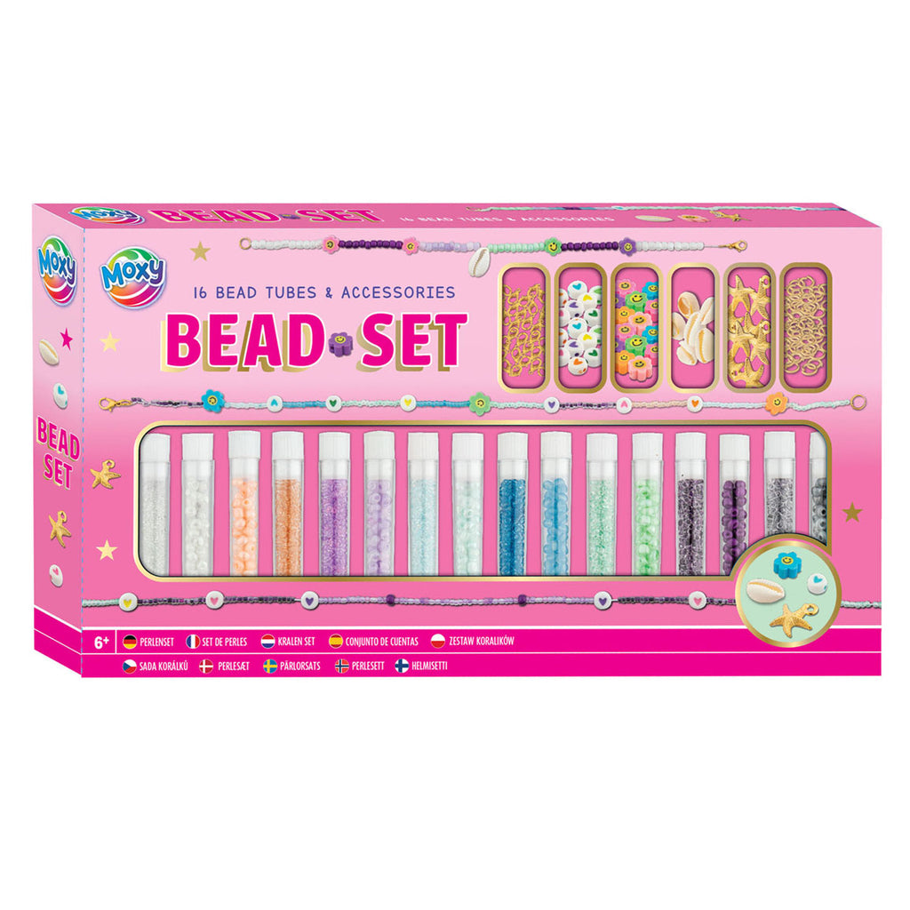 Kralenset met 16 buisjes kralen in o.a. parelmoer en metallic kleuren, en verschillende accessoires waaronder bedels, sluitingen en draad. Geschikt vanaf 6 jaar.